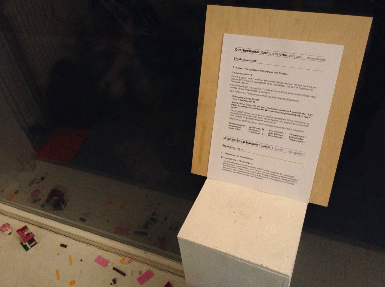 Das Projekt "Plot" greift ein Stück Mikrogeschichte des Karoviertels auf. Es verknüpft ein Videofragment von 1989 über die Räumung der LAMA-Häuser in der Laeiszstraße mit deren Abriss und der an dieser Stelle heute noch existierenden Brache. Der Stillstand auf der Brachfläche steht in krassem Gegensatz zu dem vollständig gewandelten Erscheinungsbild des Viertels. Vor dem Hintergrund der hier herrschenden Dauer erscheint die parallele, als Vorzeige-Stadtentwicklung beworbene Umstrukturierung nicht so natürlich, wie beim Schwätzchen auf dem Knochen. War da nicht noch was? Haben wir nicht etwas vergessen? Niemand vermisst etwas?