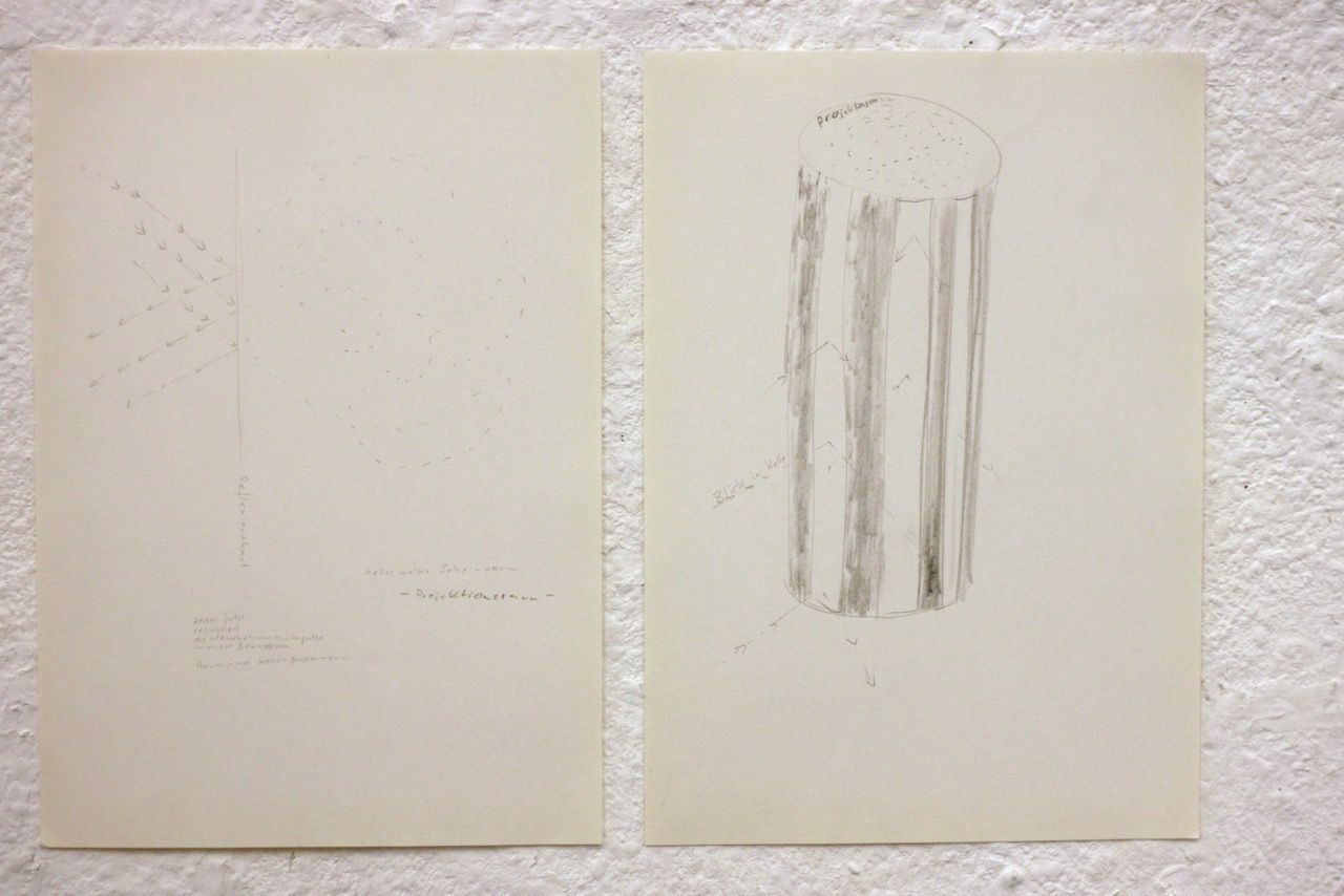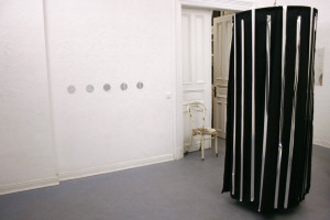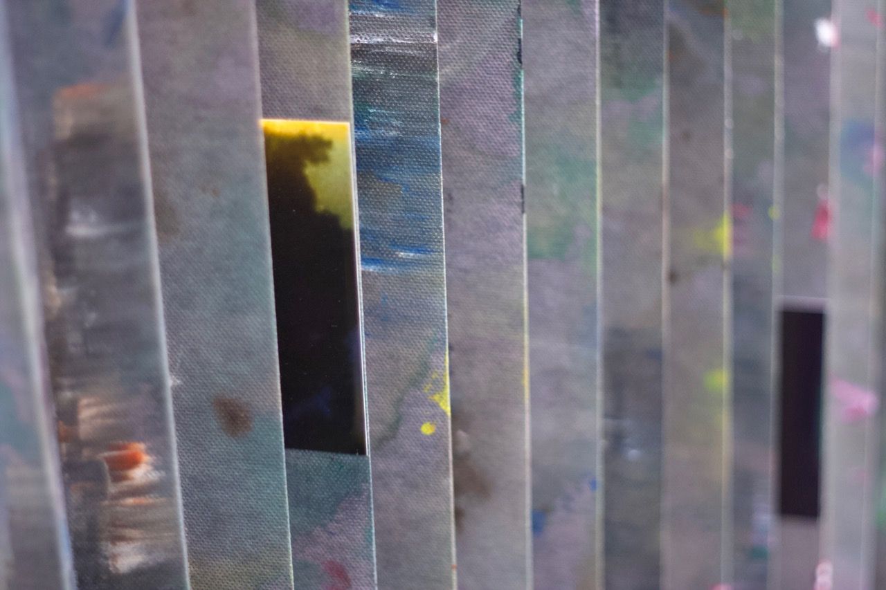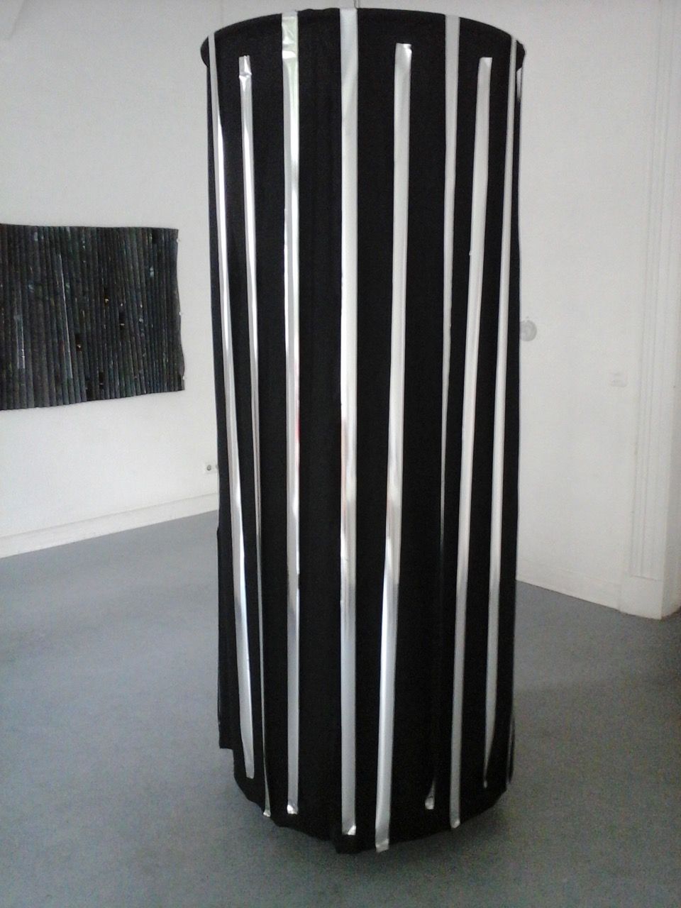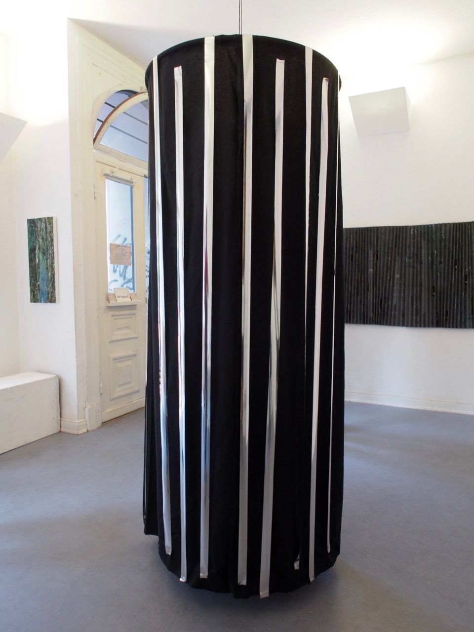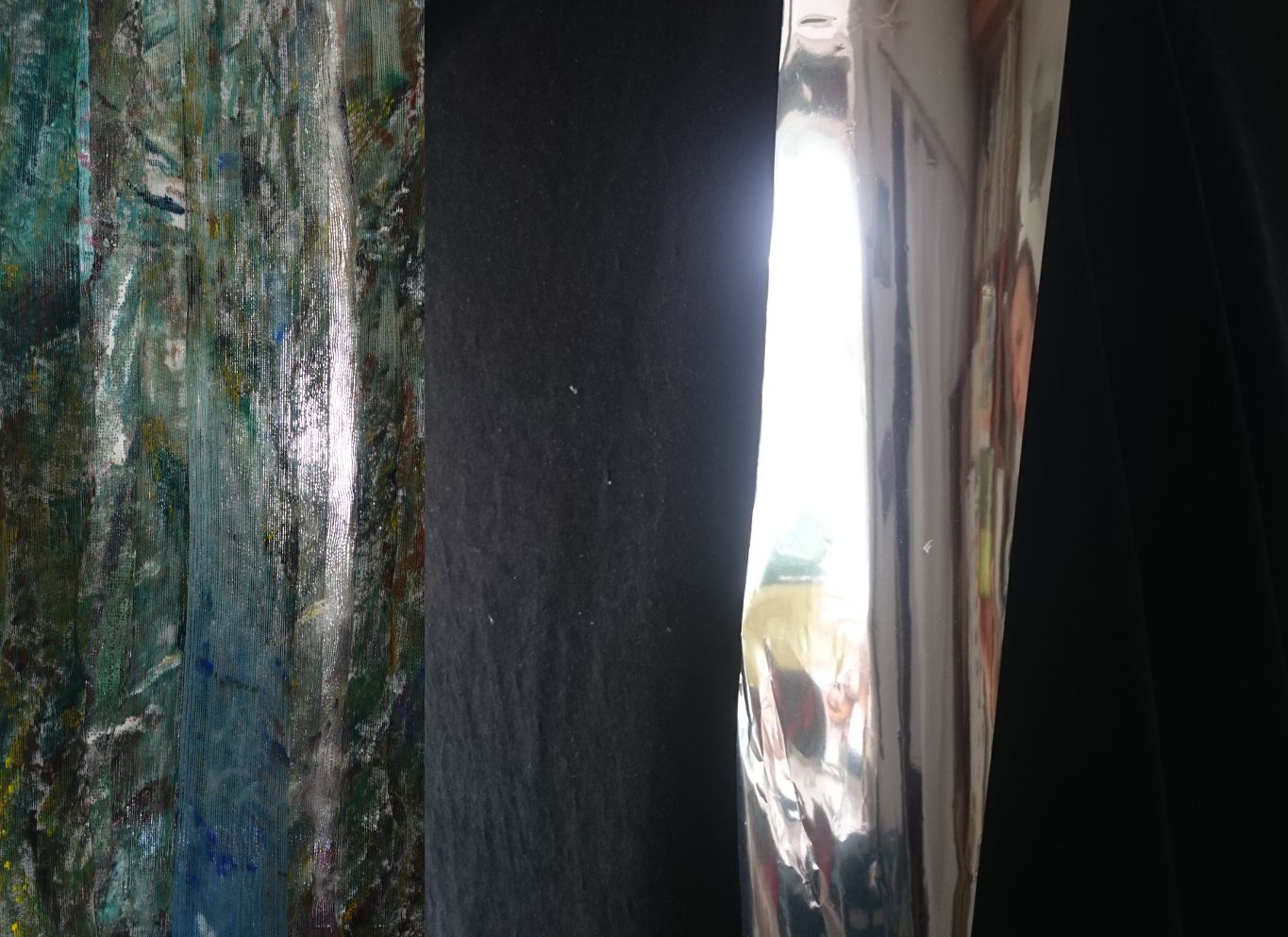 Ein kleiner Bereich in der Mitte des Raums bleibt dunkel umhüllt. Unebene Spiegelstreifen erfassen die Bewegung vom Betrachter vielfältig. Bruchstückhaft und temporär erscheinen Farben der Umgebung und verbinden sich mit jeder Bewegung der Betrachter. Heilwig Jacob
