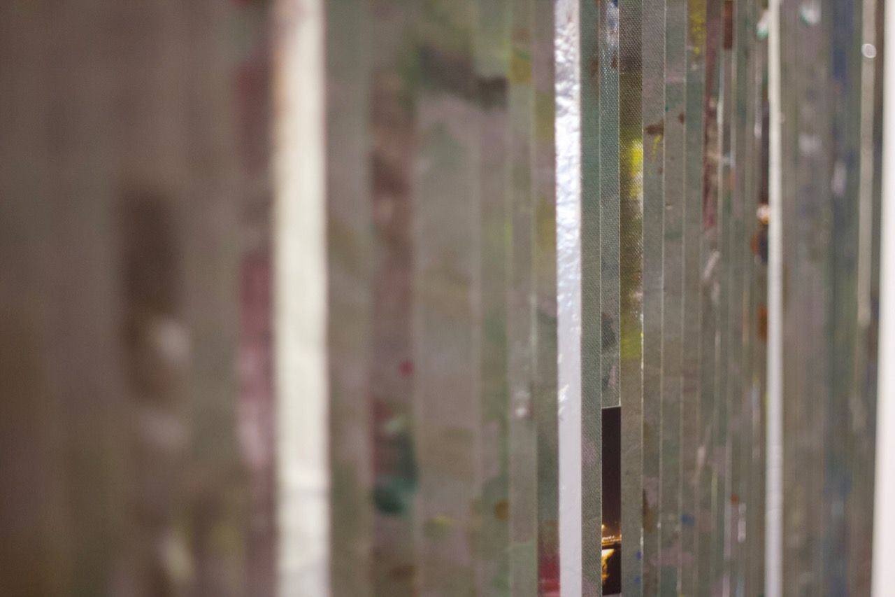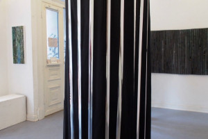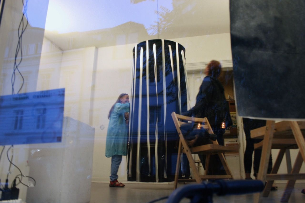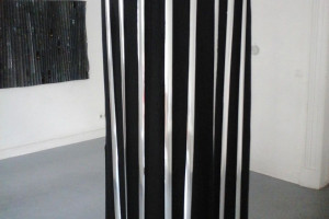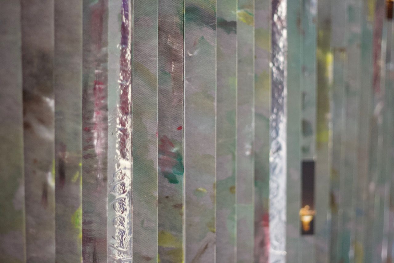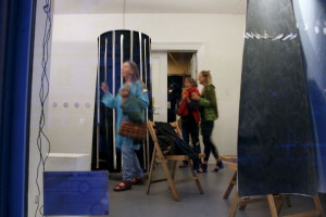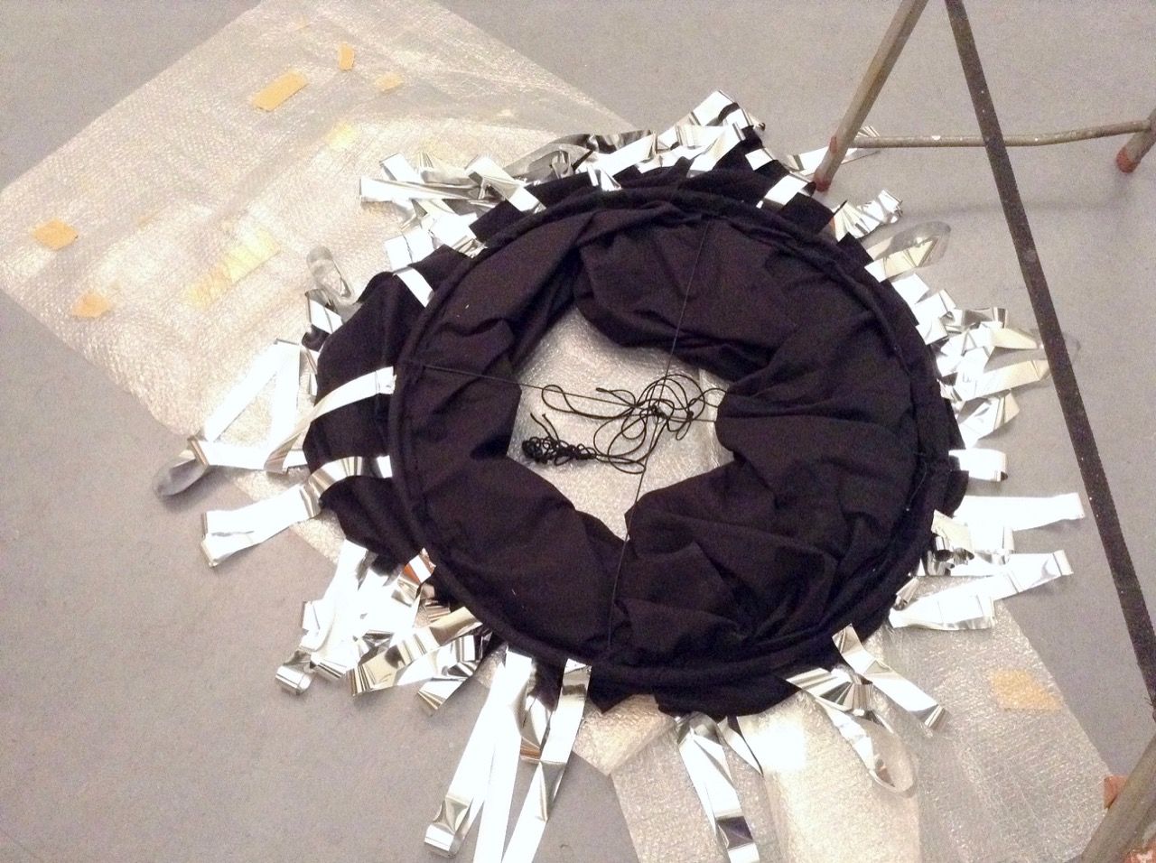 Ein kleiner Bereich in der Mitte des Raums bleibt dunkel umhüllt. Unebene Spiegelstreifen erfassen die Bewegung vom Betrachter vielfältig. Bruchstückhaft und temporär erscheinen Farben der Umgebung und verbinden sich mit jeder Bewegung der Betrachter. Heilwig Jacob