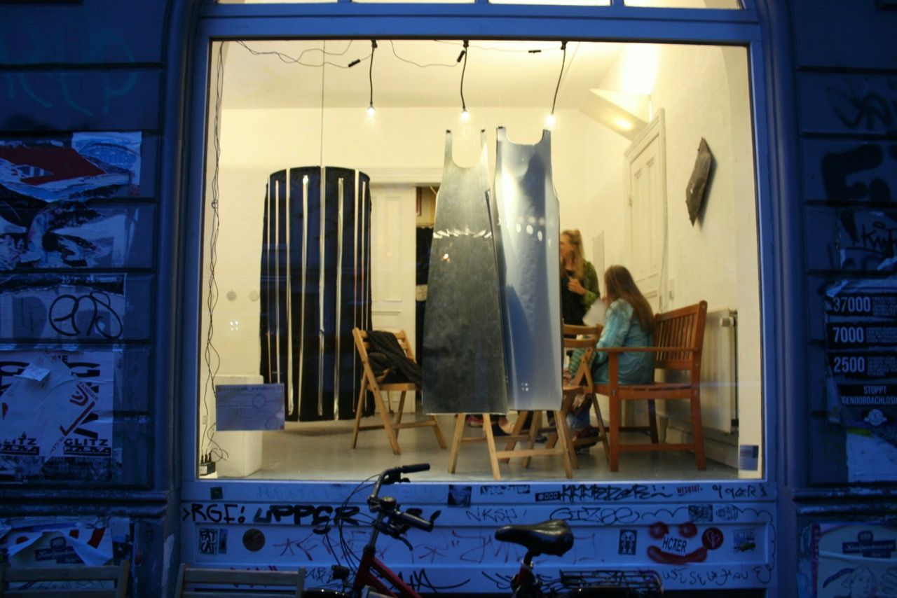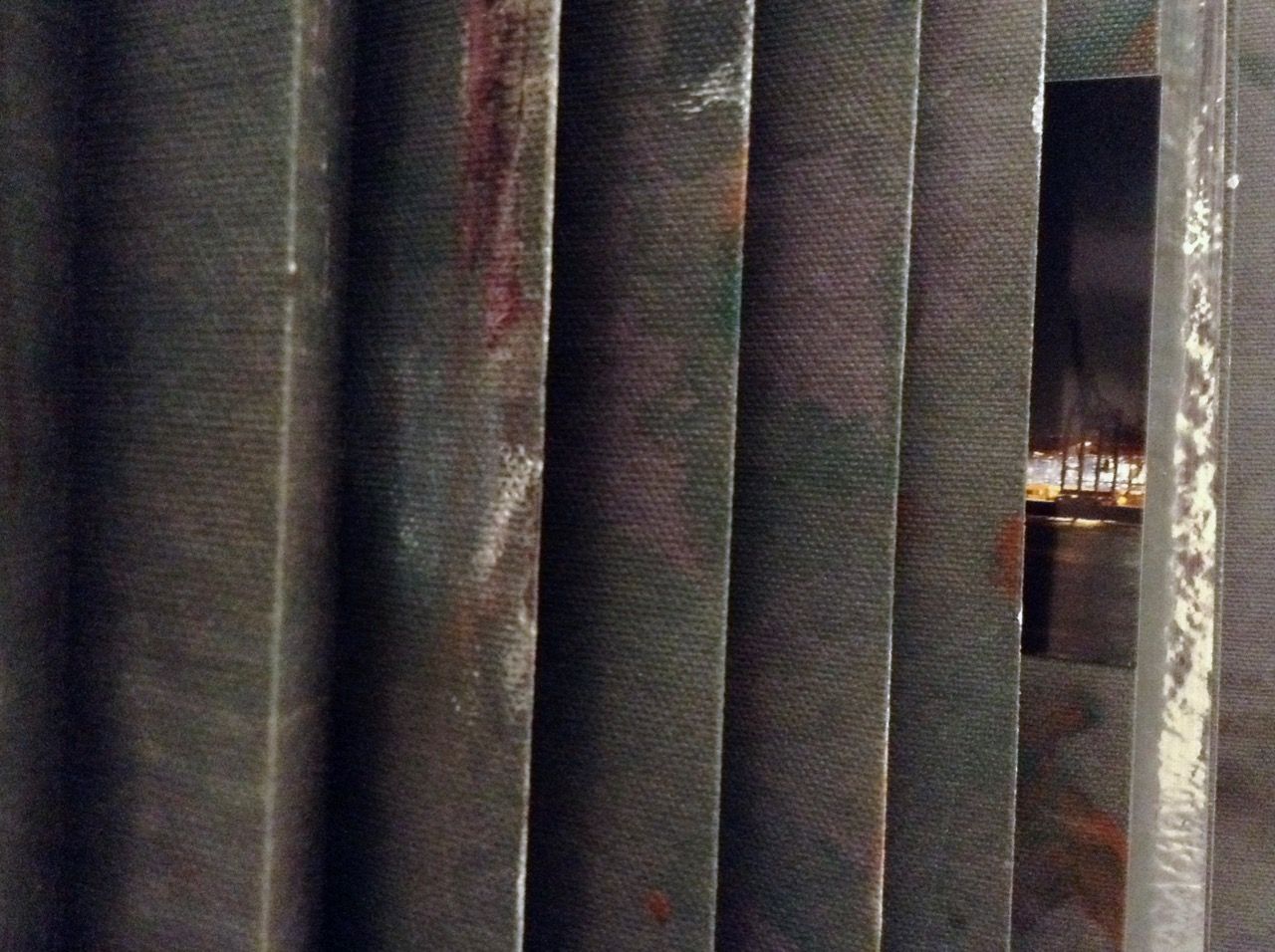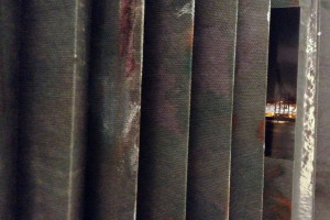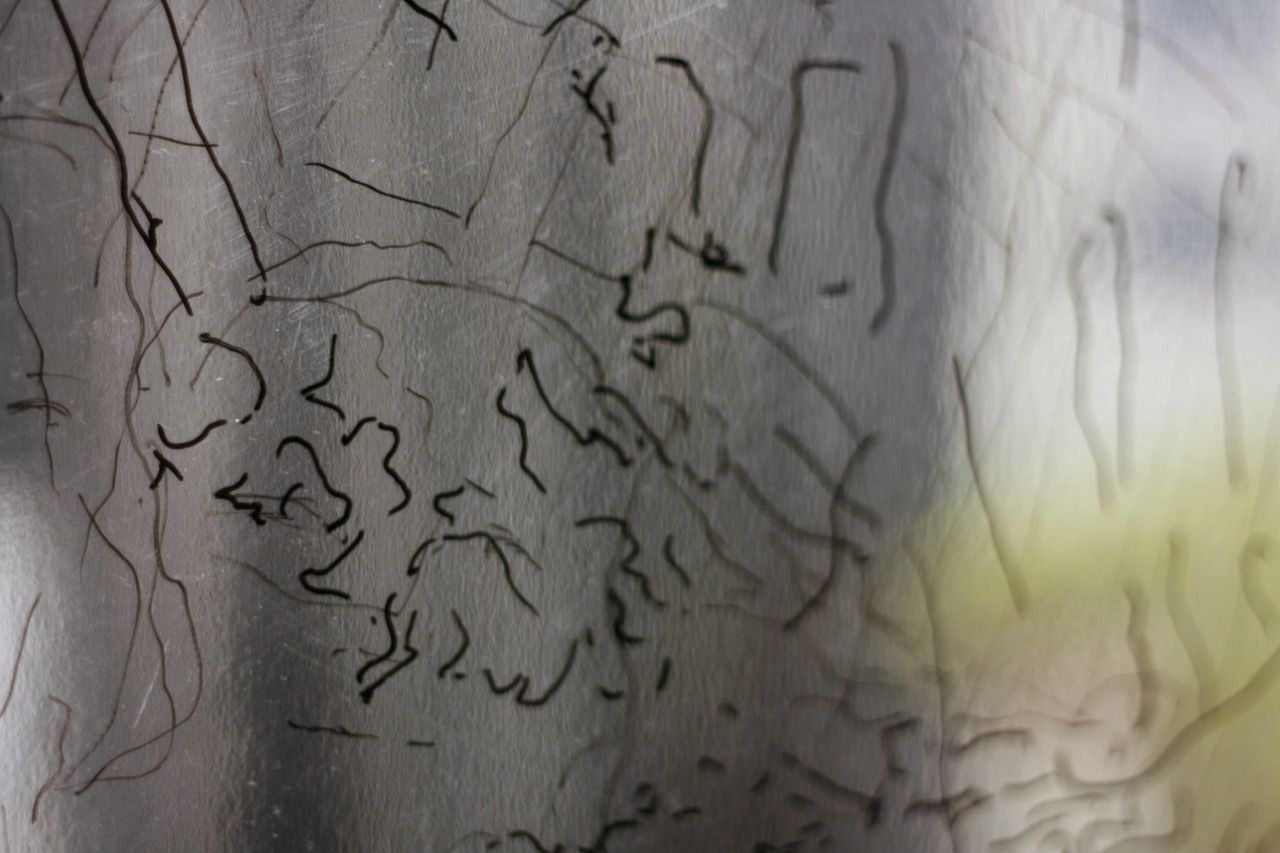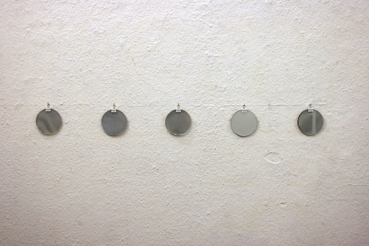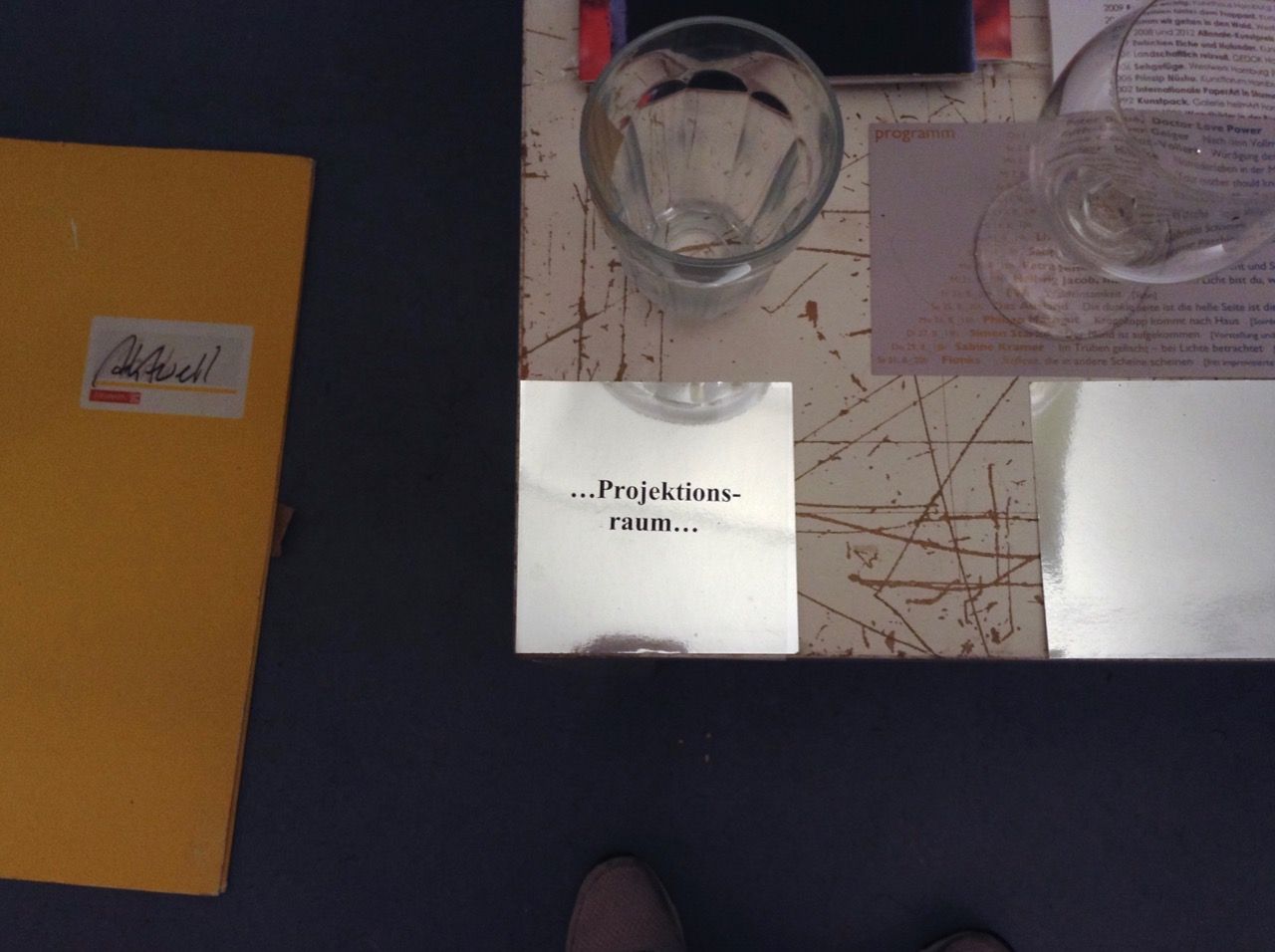 Ein kleiner Bereich in der Mitte des Raums bleibt dunkel umhüllt. Unebene Spiegelstreifen erfassen die Bewegung vom Betrachter vielfältig. Bruchstückhaft und temporär erscheinen Farben der Umgebung und verbinden sich mit jeder Bewegung der Betrachter. Heilwig Jacob