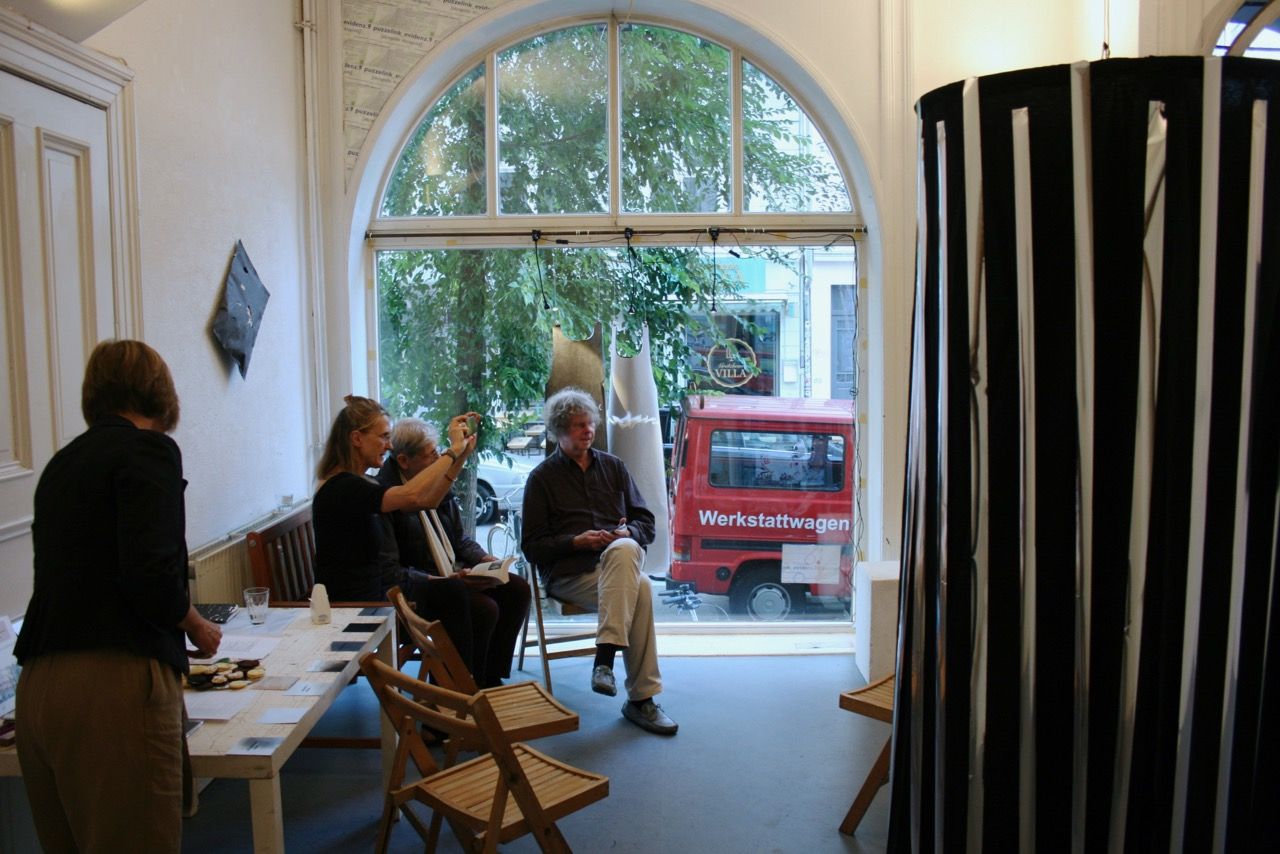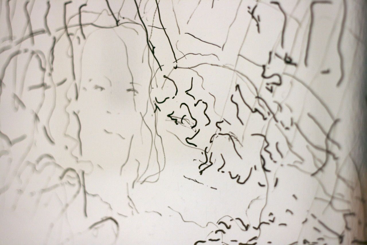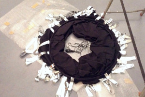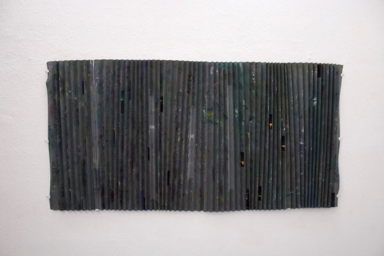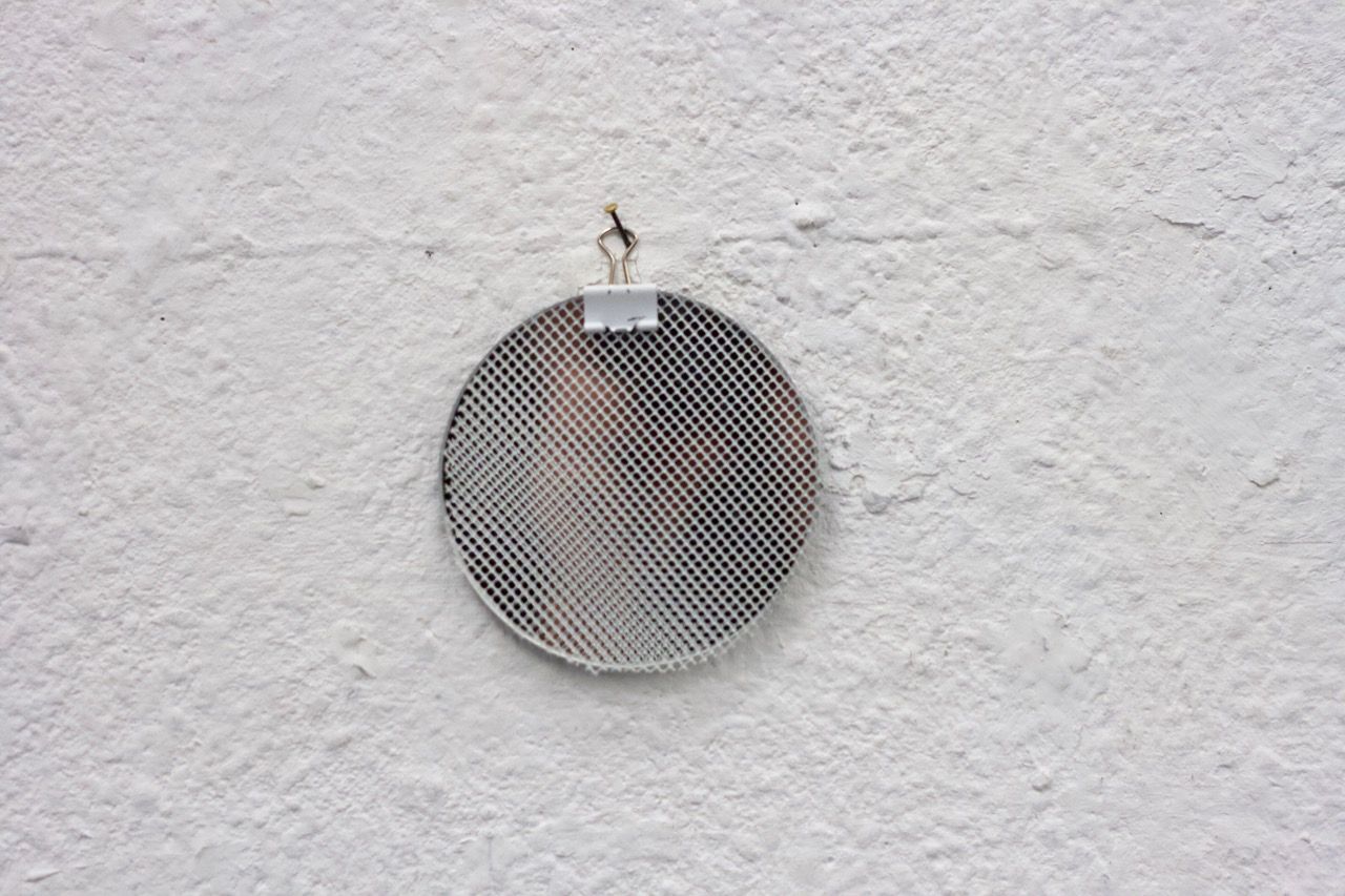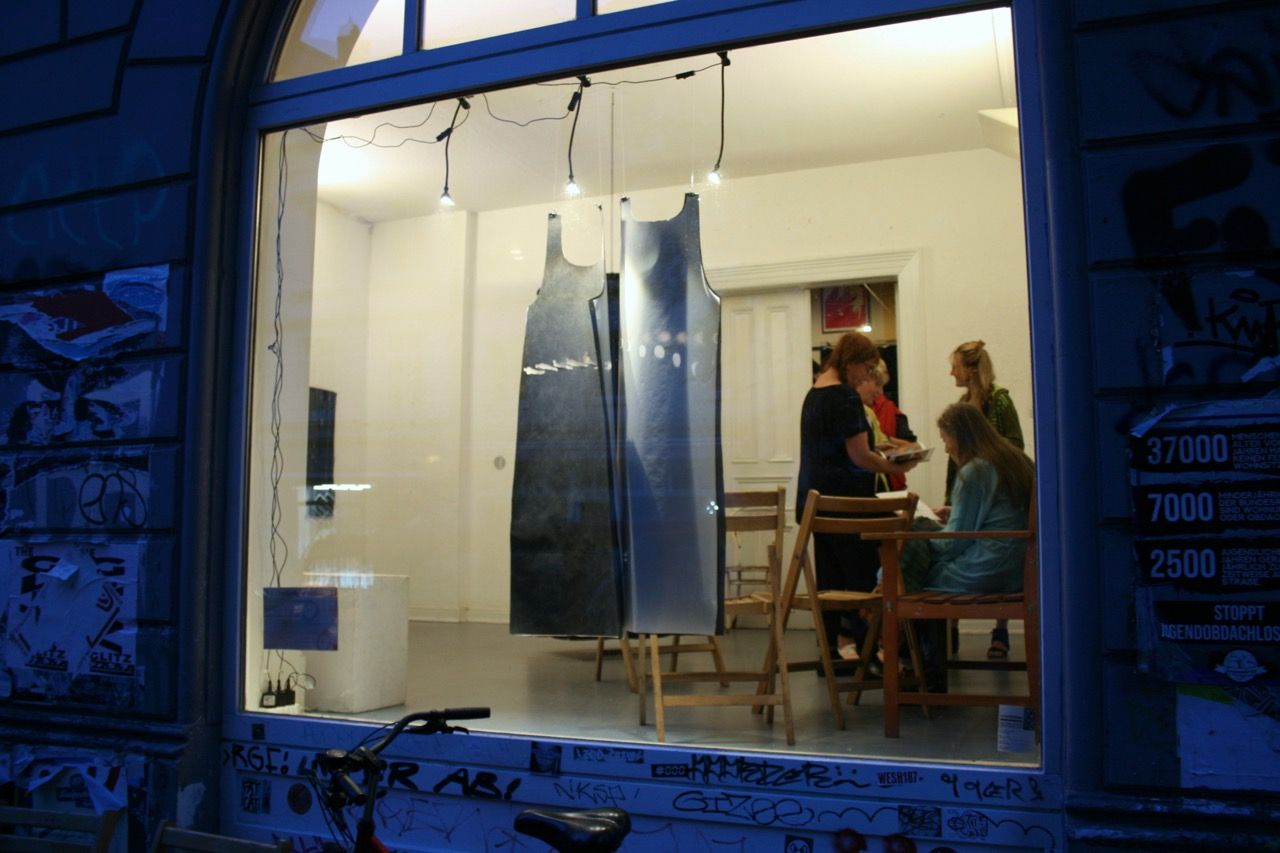 Ein kleiner Bereich in der Mitte des Raums bleibt dunkel umhüllt. Unebene Spiegelstreifen erfassen die Bewegung vom Betrachter vielfältig. Bruchstückhaft und temporär erscheinen Farben der Umgebung und verbinden sich mit jeder Bewegung der Betrachter. Heilwig Jacob