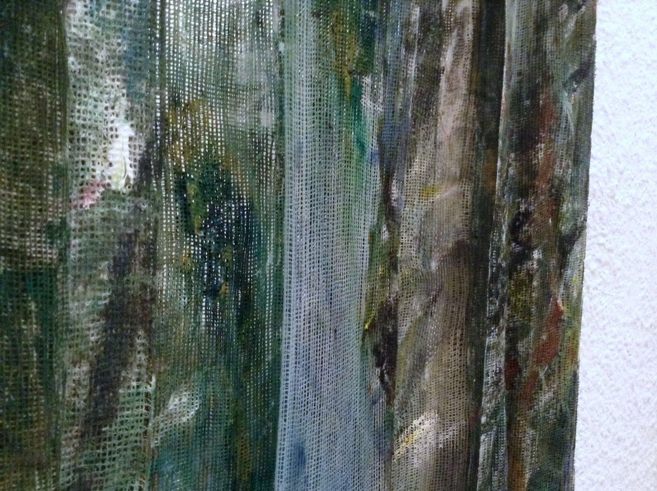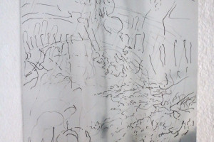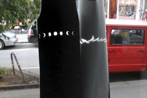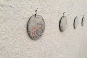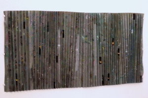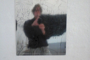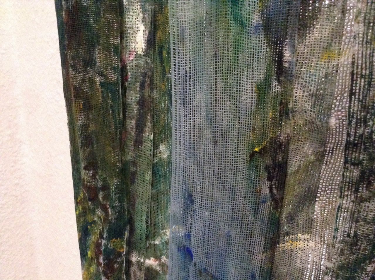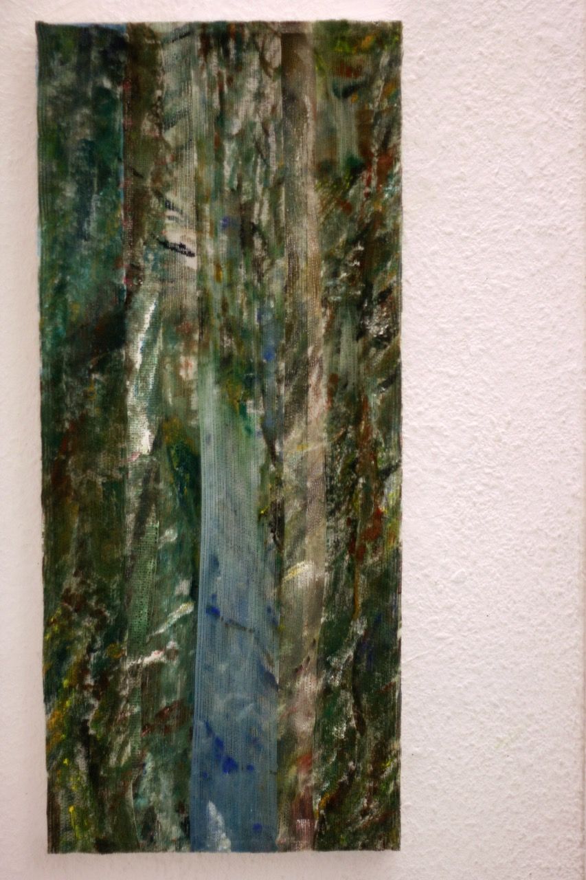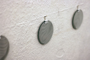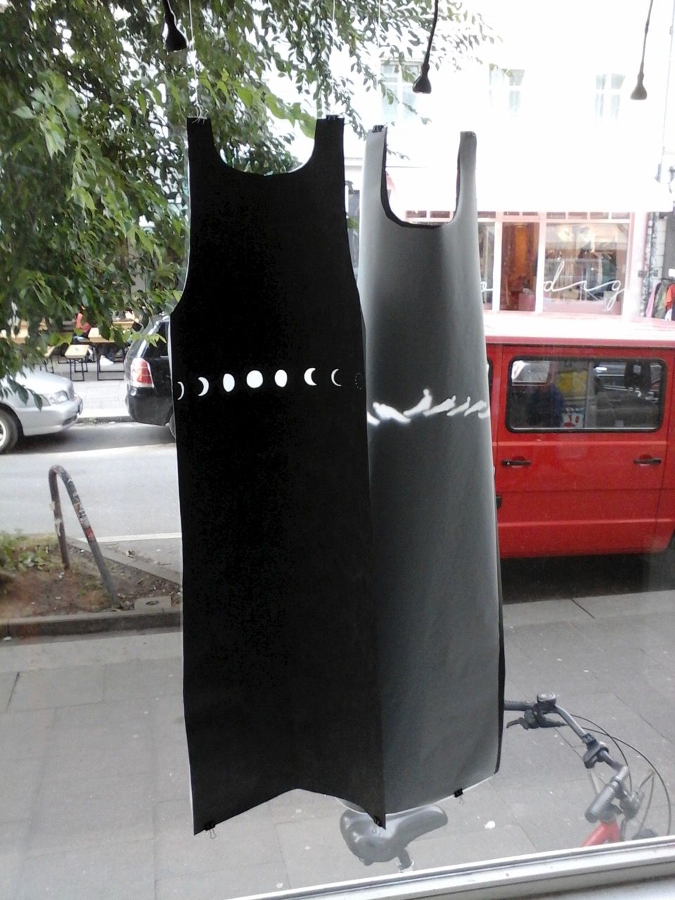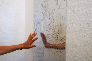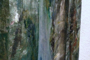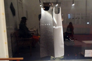 Ein kleiner Bereich in der Mitte des Raums bleibt dunkel umhüllt. Unebene Spiegelstreifen erfassen die Bewegung vom Betrachter vielfältig. Bruchstückhaft und temporär erscheinen Farben der Umgebung und verbinden sich mit jeder Bewegung der Betrachter. Heilwig Jacob