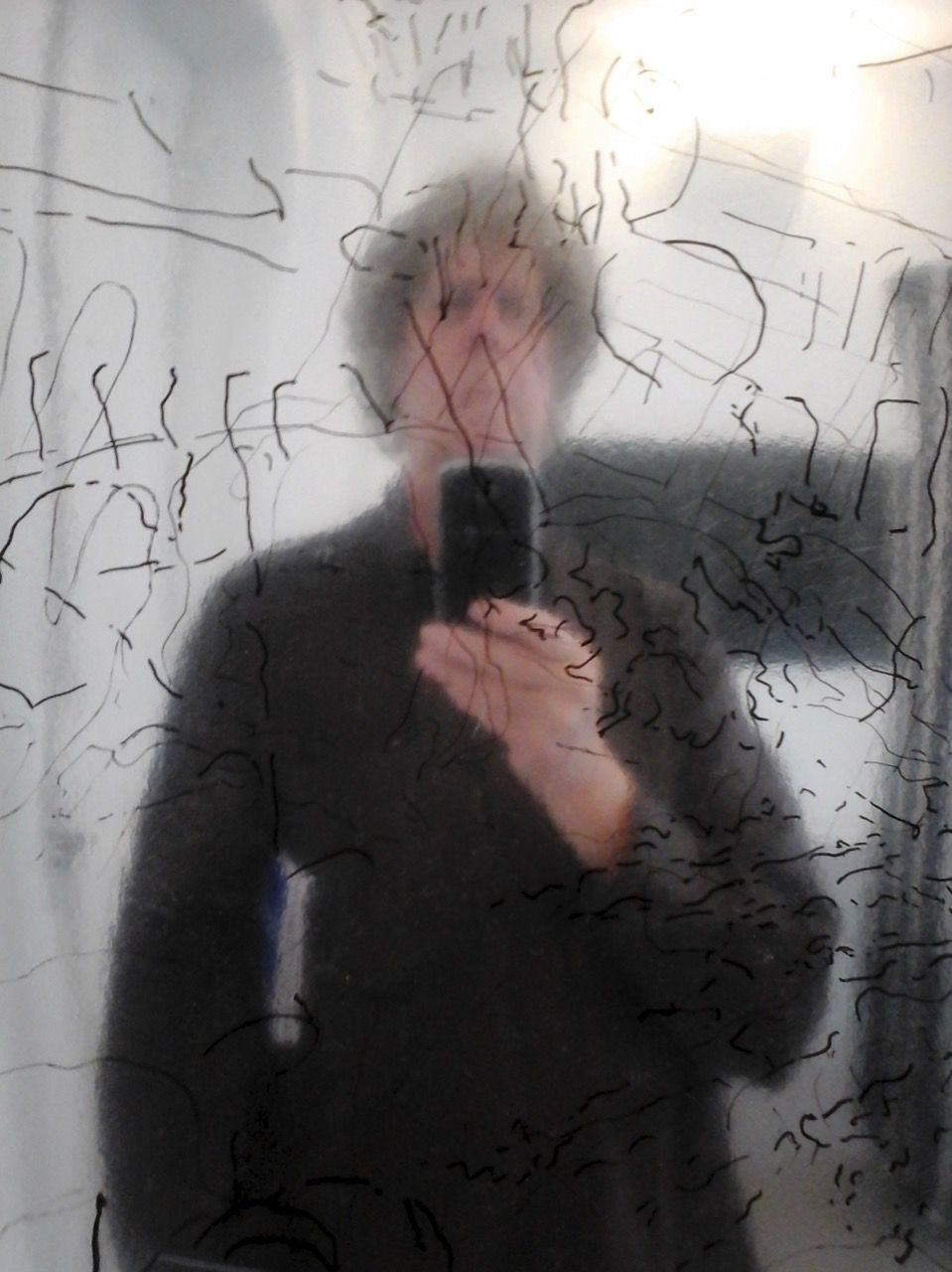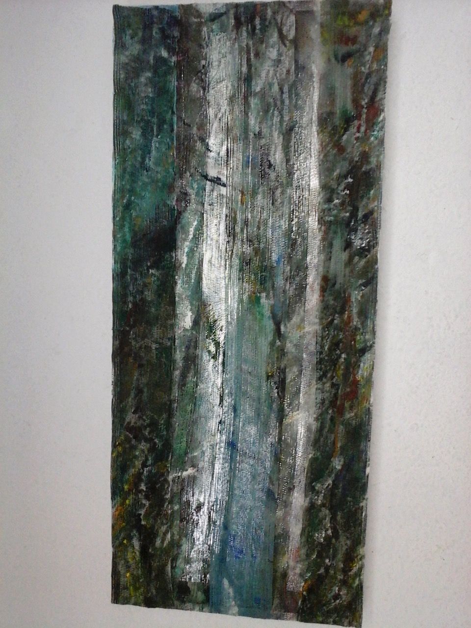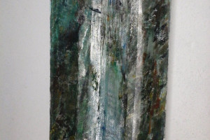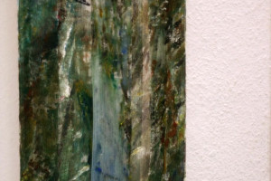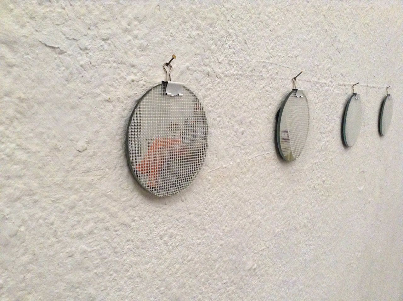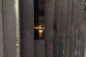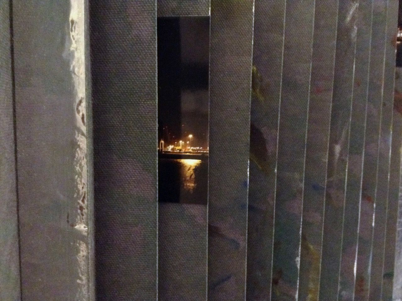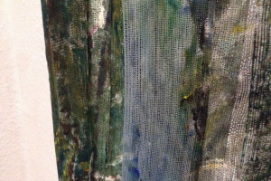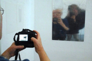 Ein kleiner Bereich in der Mitte des Raums bleibt dunkel umhüllt. Unebene Spiegelstreifen erfassen die Bewegung vom Betrachter vielfältig. Bruchstückhaft und temporär erscheinen Farben der Umgebung und verbinden sich mit jeder Bewegung der Betrachter. Heilwig Jacob