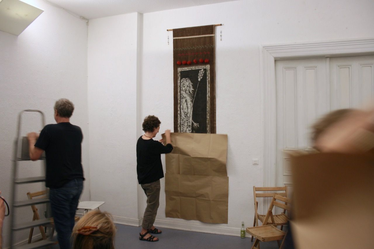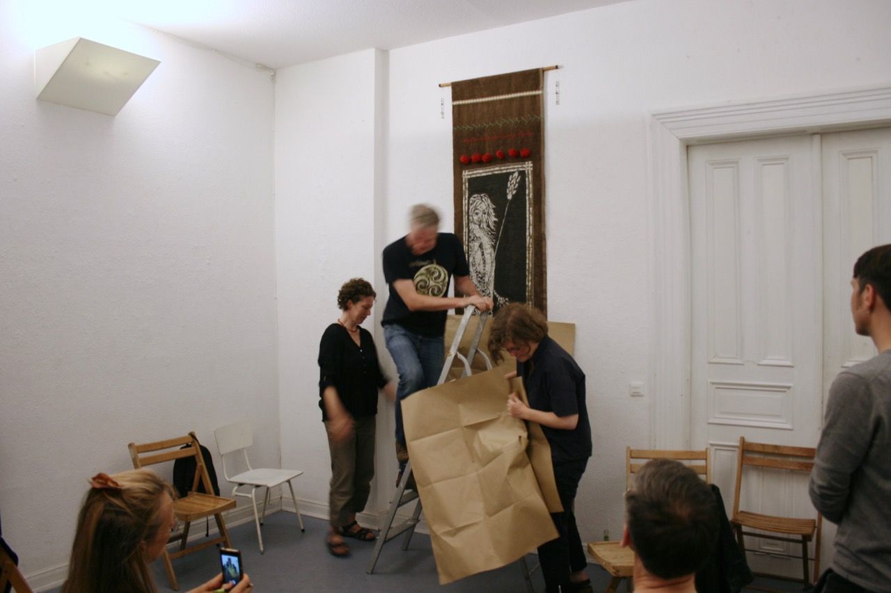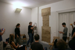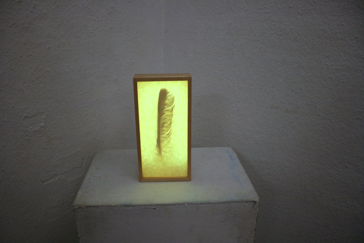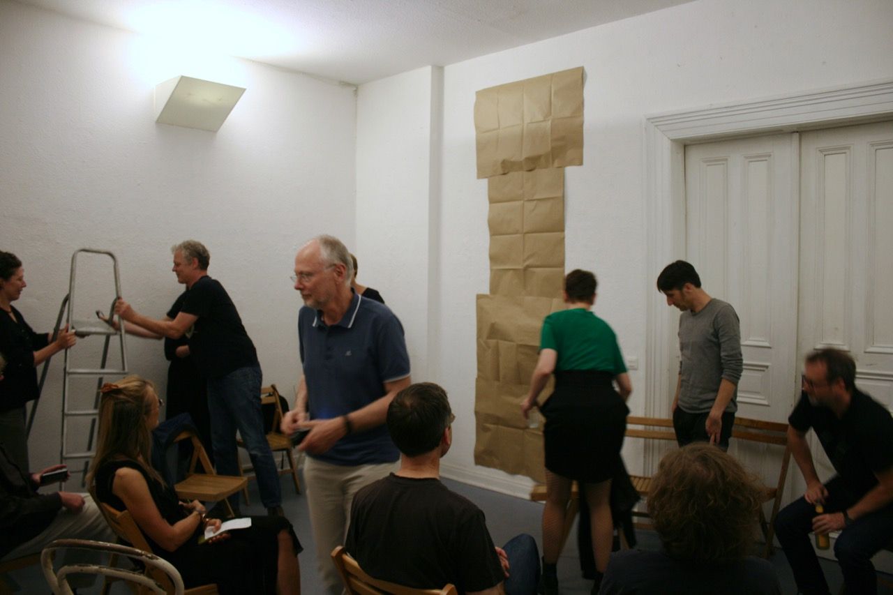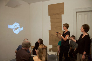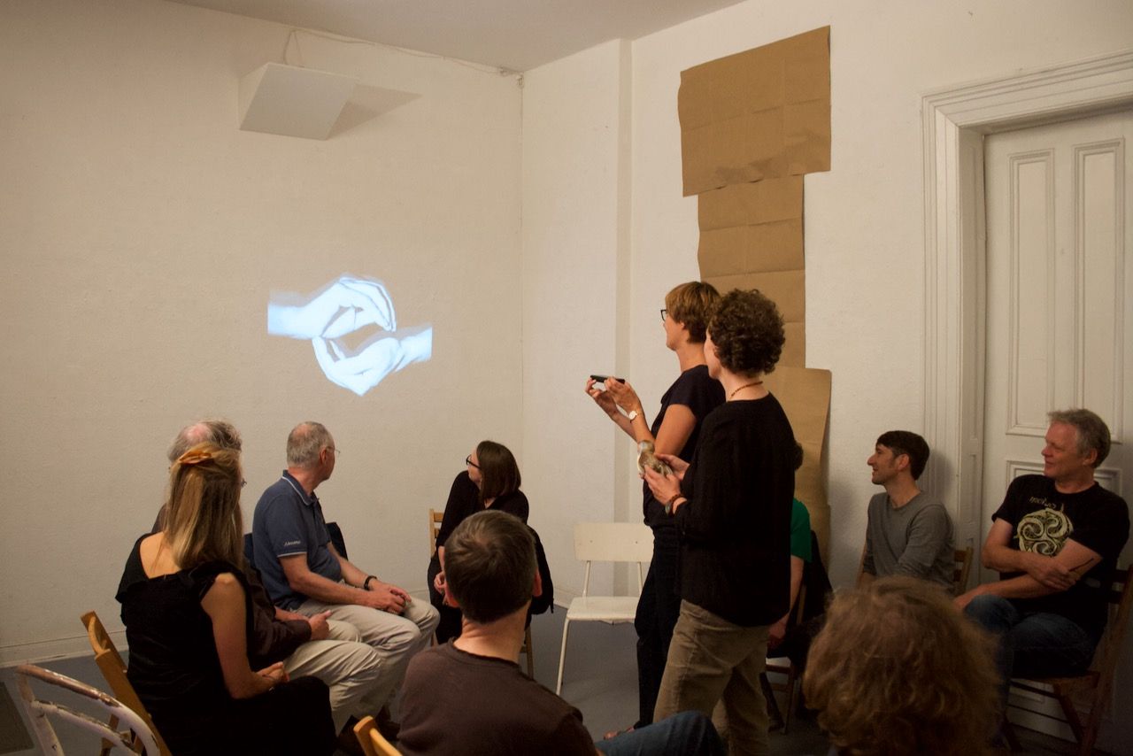 Eine Kunstschau. Umhergezeigt und vorgeführt werden Gebilde aus Licht, Stoff, Holz, Tusche, Bleistift und Papier.