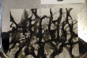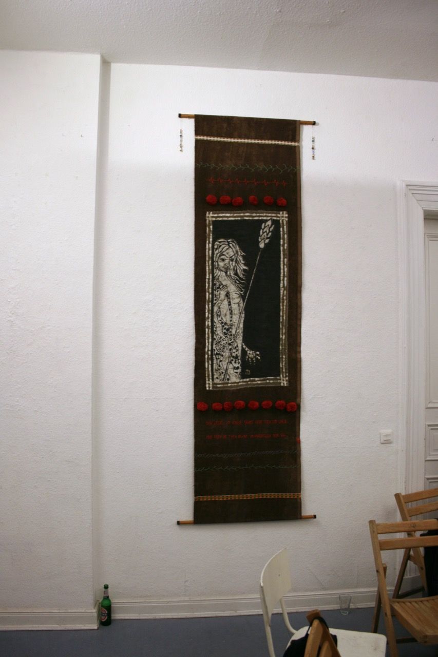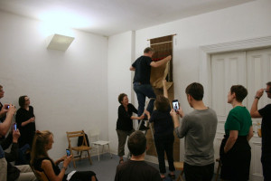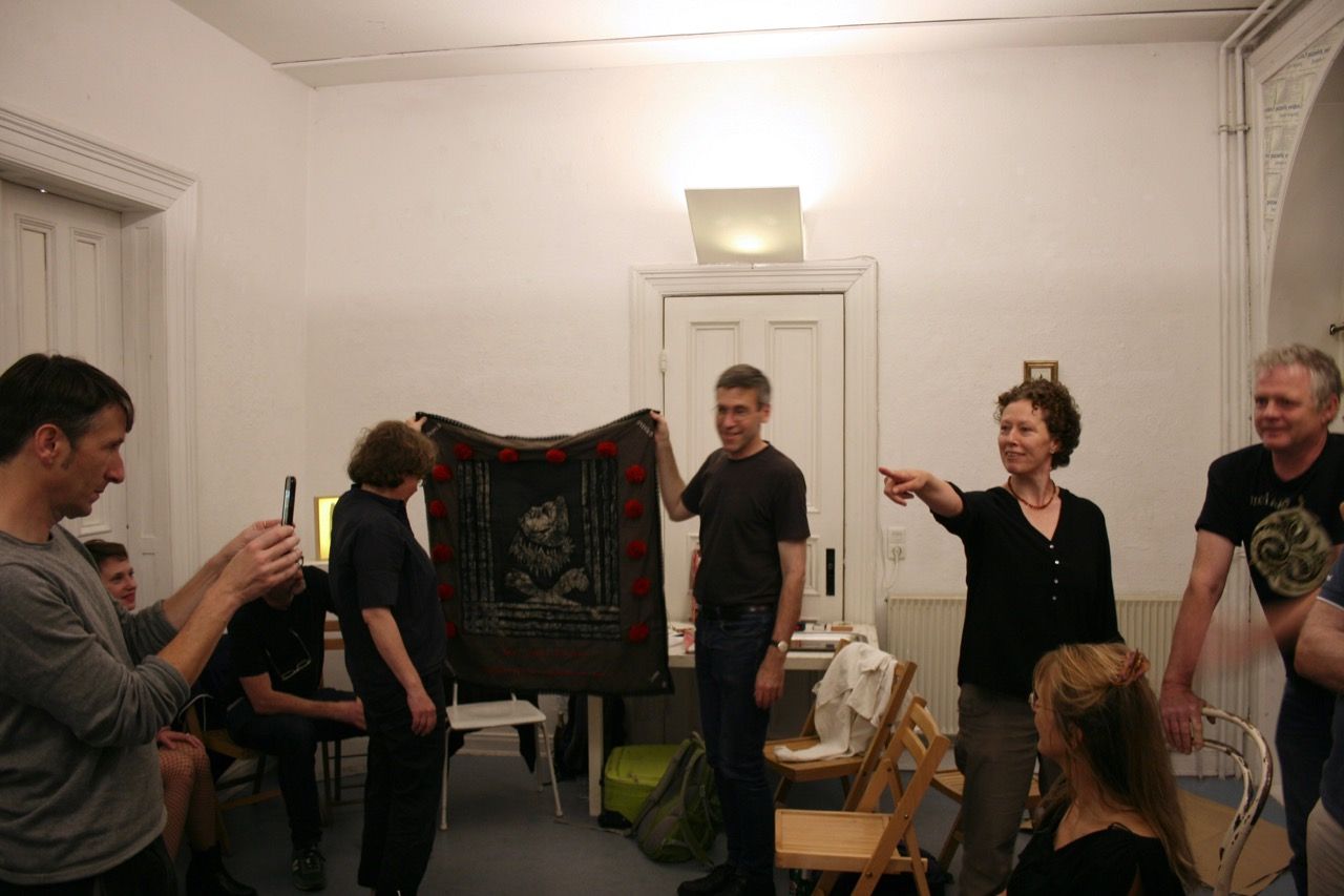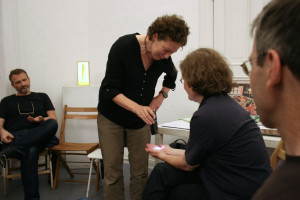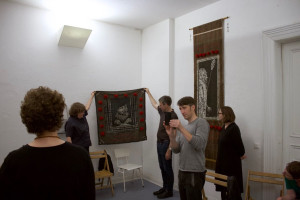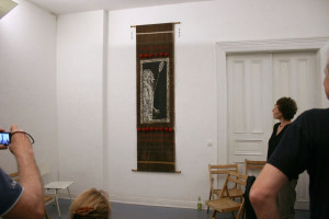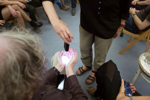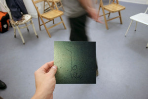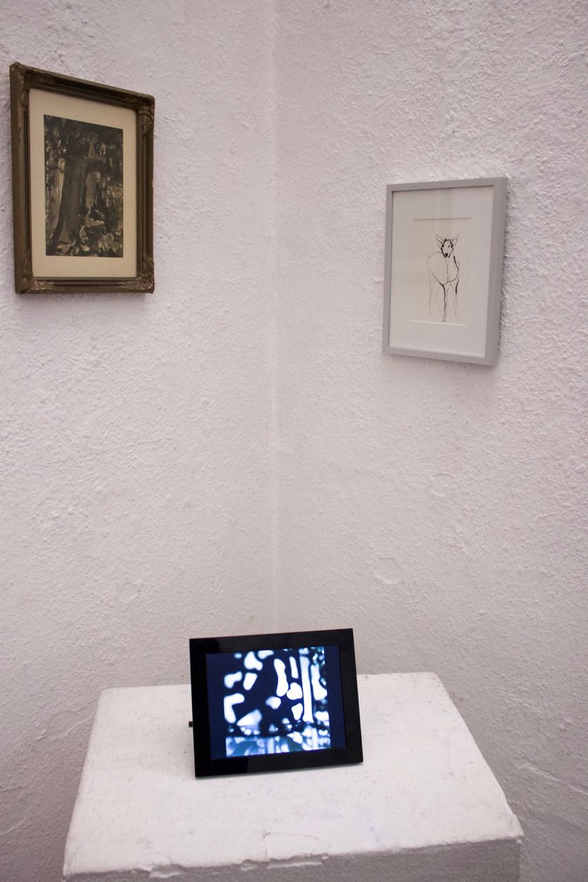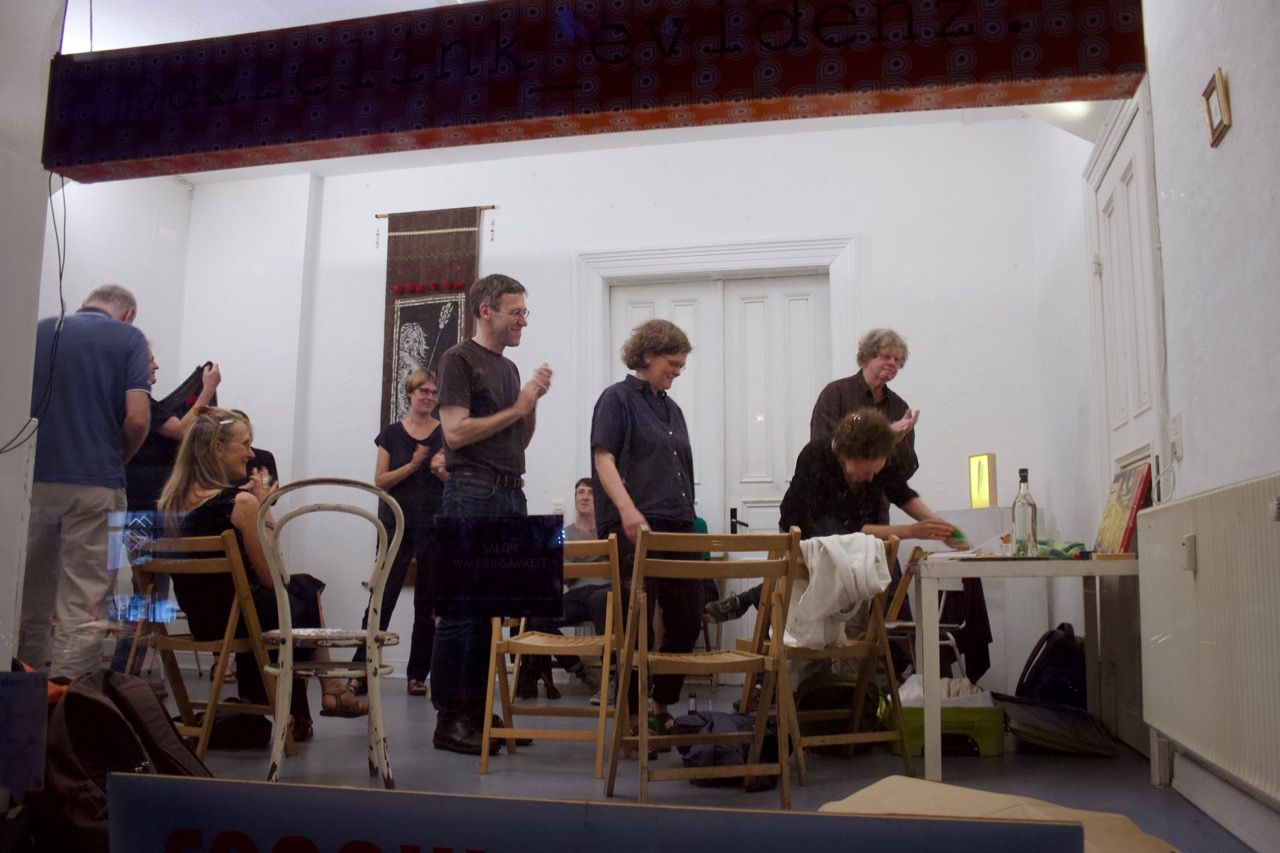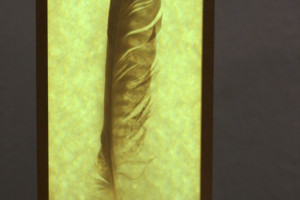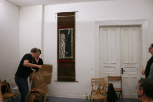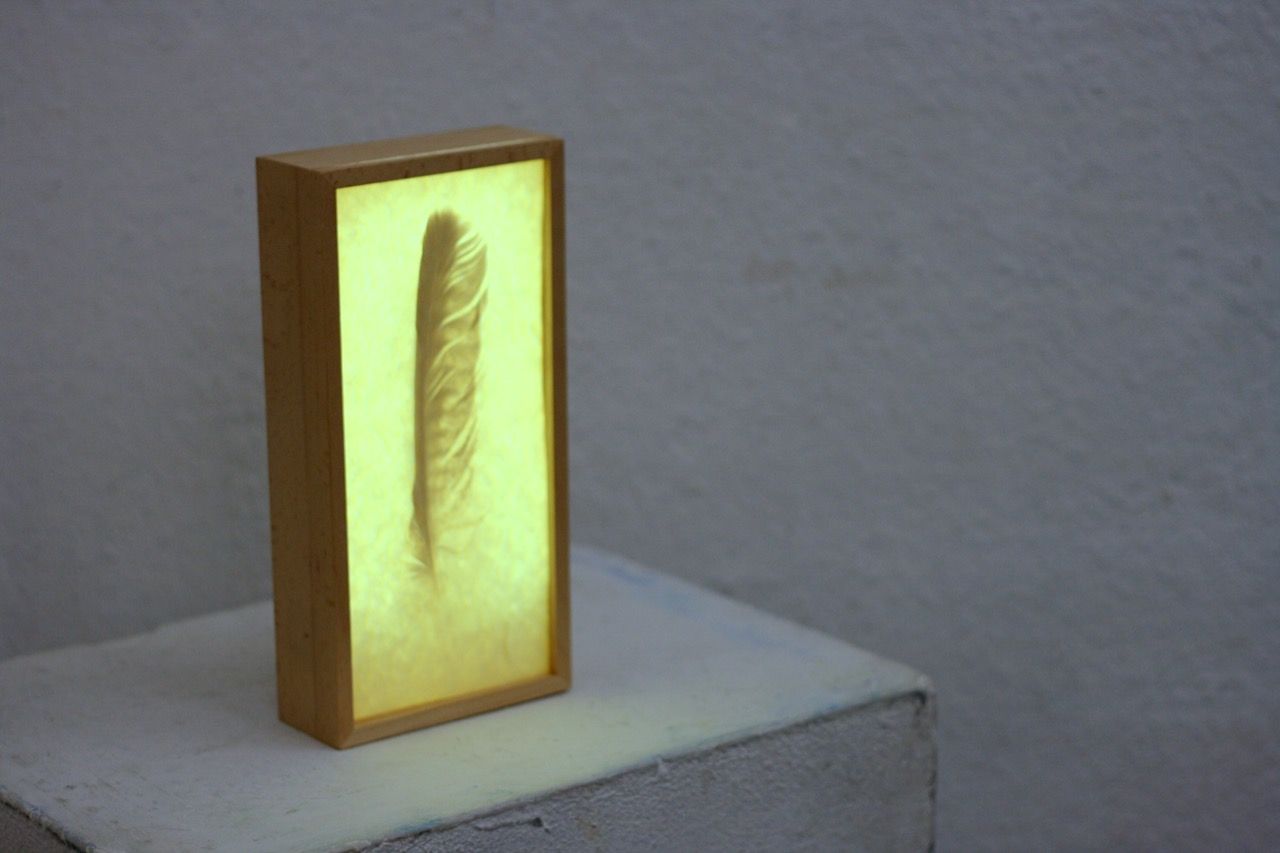 Eine Kunstschau. Umhergezeigt und vorgeführt werden Gebilde aus Licht, Stoff, Holz, Tusche, Bleistift und Papier.