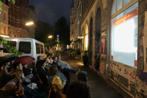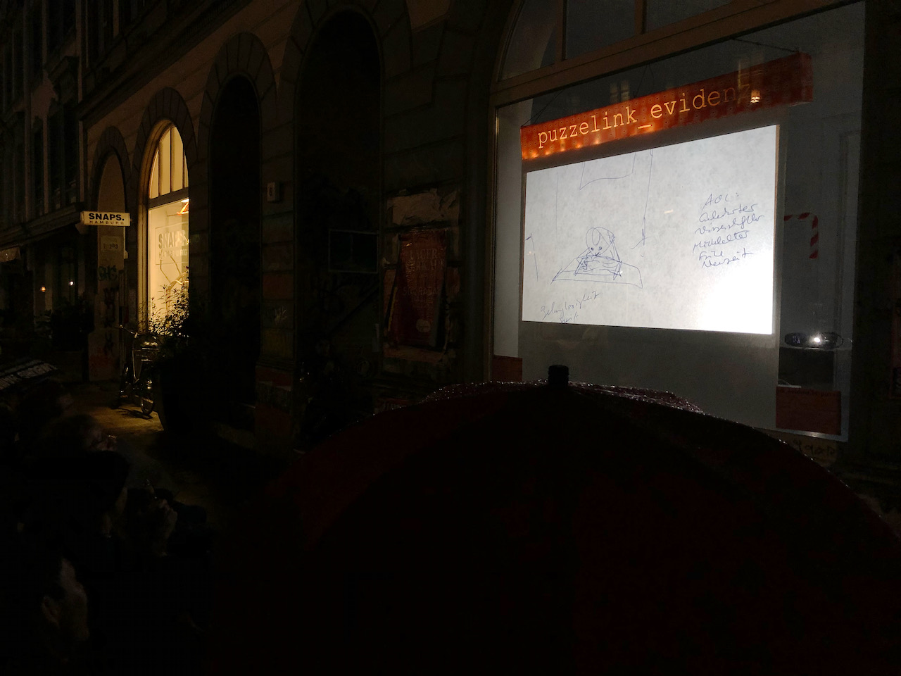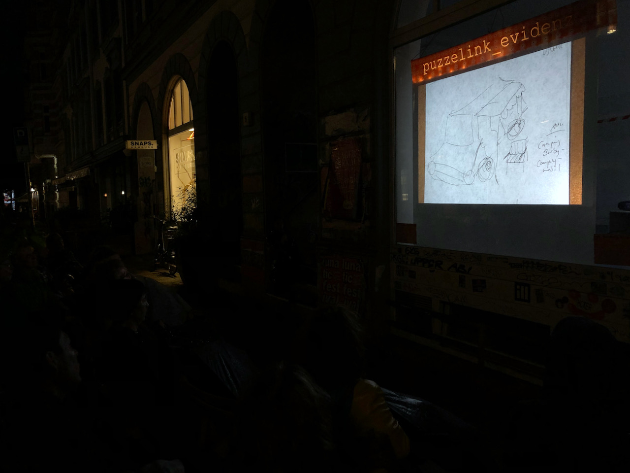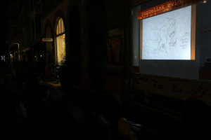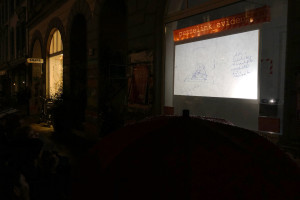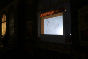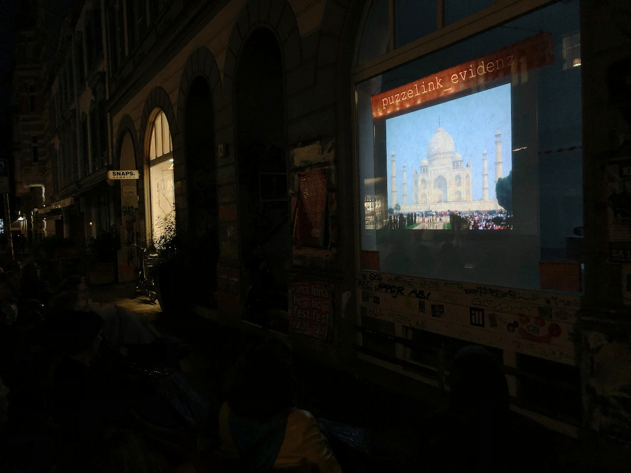 Die Bilder zum Vortrag werden nach außen auf die Straße projiziert. Der Vortrag beginnt bei Anbruch der Dunkelheit.