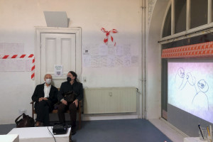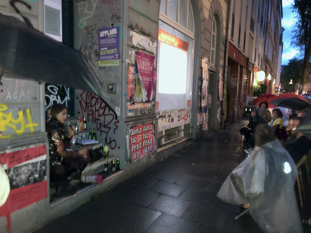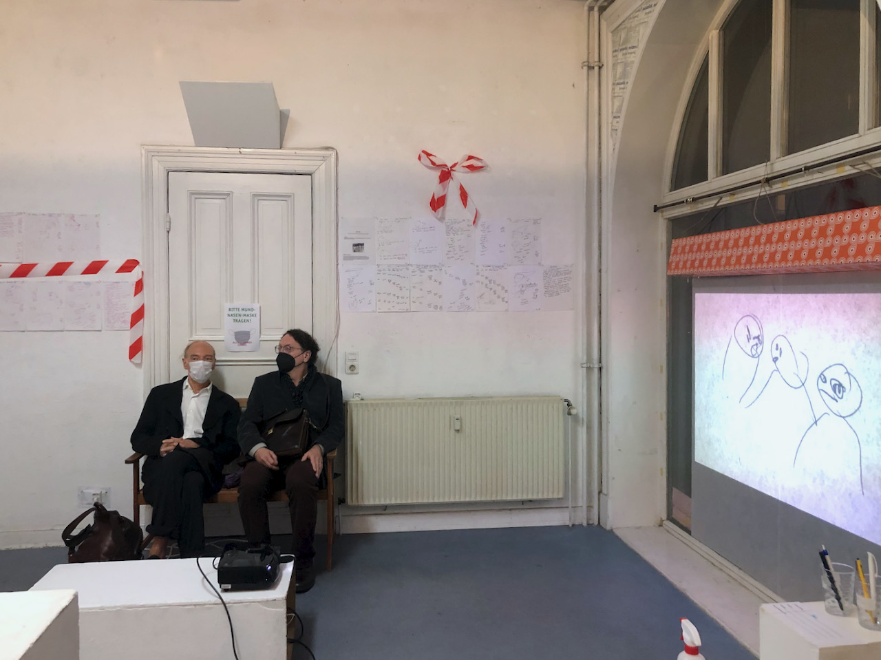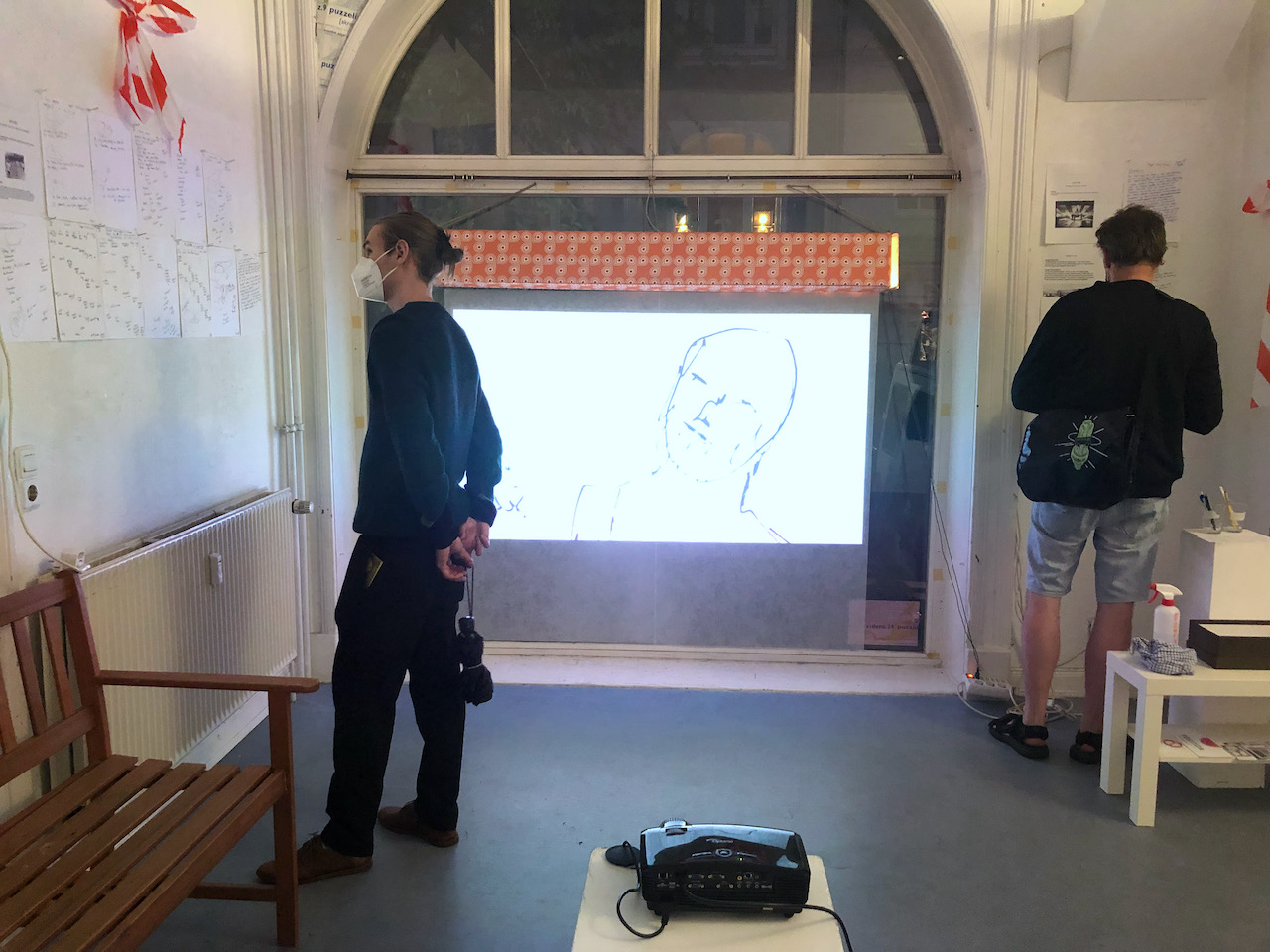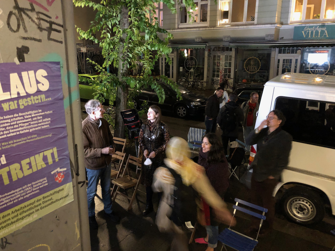 Die Bilder zum Vortrag werden nach außen auf die Straße projiziert. Der Vortrag beginnt bei Anbruch der Dunkelheit.