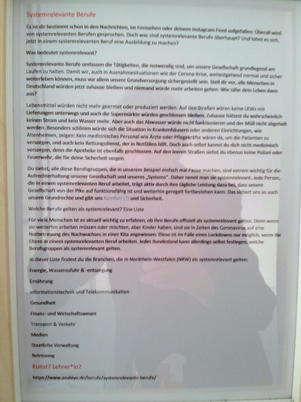 Künstler liefere frei Haus kostengünstig Ablenkung, positiv formulierte Projekte, die Spass machen, die Lehrer begeistern, die Zerstörung aufzufangen, die Kinder aus der Vereinsamung rausholen, die das Lerndefizit spielerisch aufholen. Wir jurieren die besten Eingaben! Wer gewinnt kriegt ein Zuschlägle, vor all den andern, die ganz leer ausgehen.