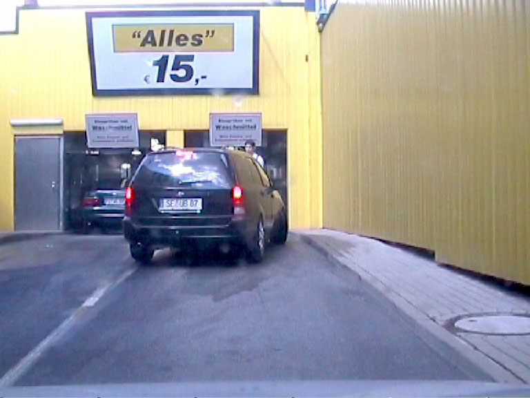 Eineinhalb Durchfahrten mit dem Auto durch eine Waschanlage. Voll