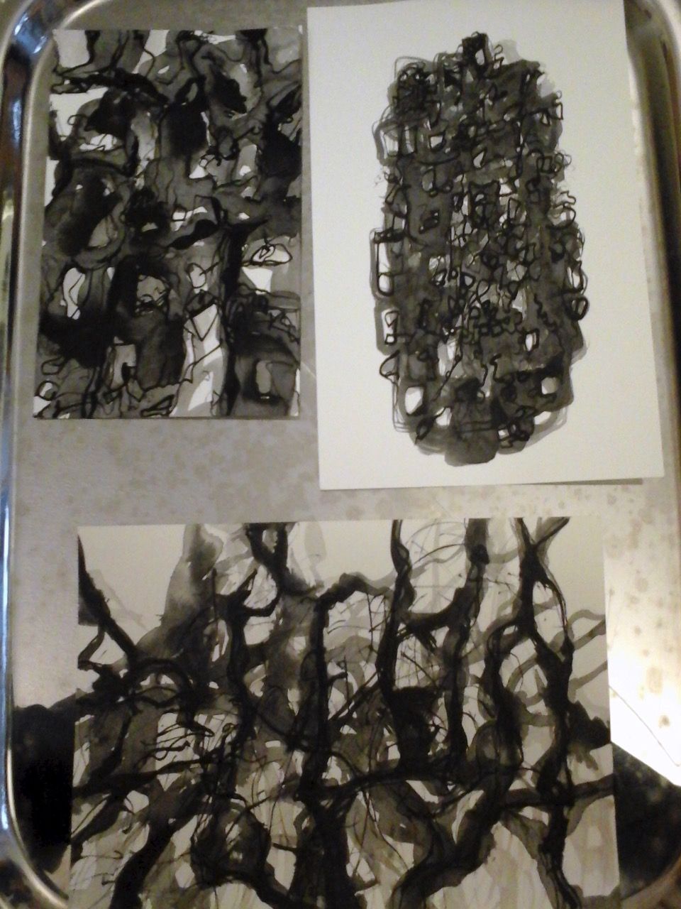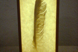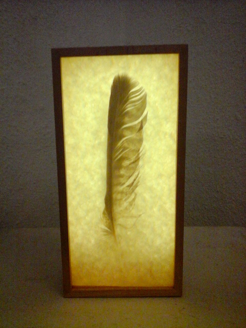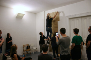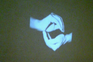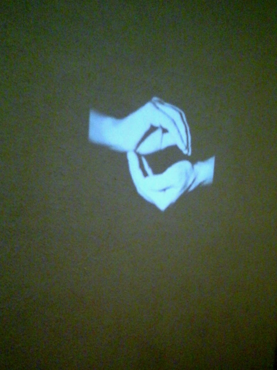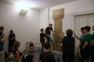 Eine Kunstschau. Umhergezeigt und vorgeführt werden Gebilde aus Licht, Stoff, Holz, Tusche, Bleistift und Papier.