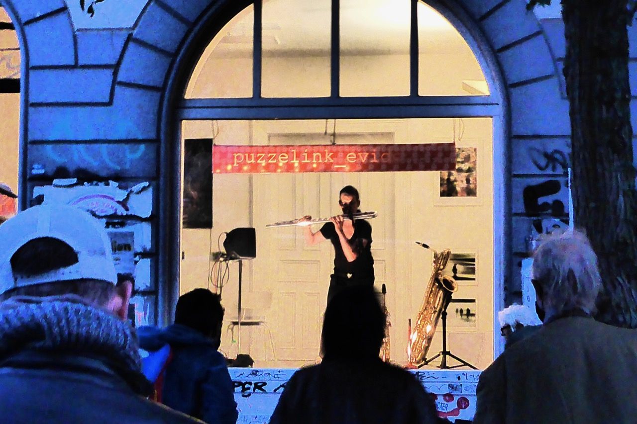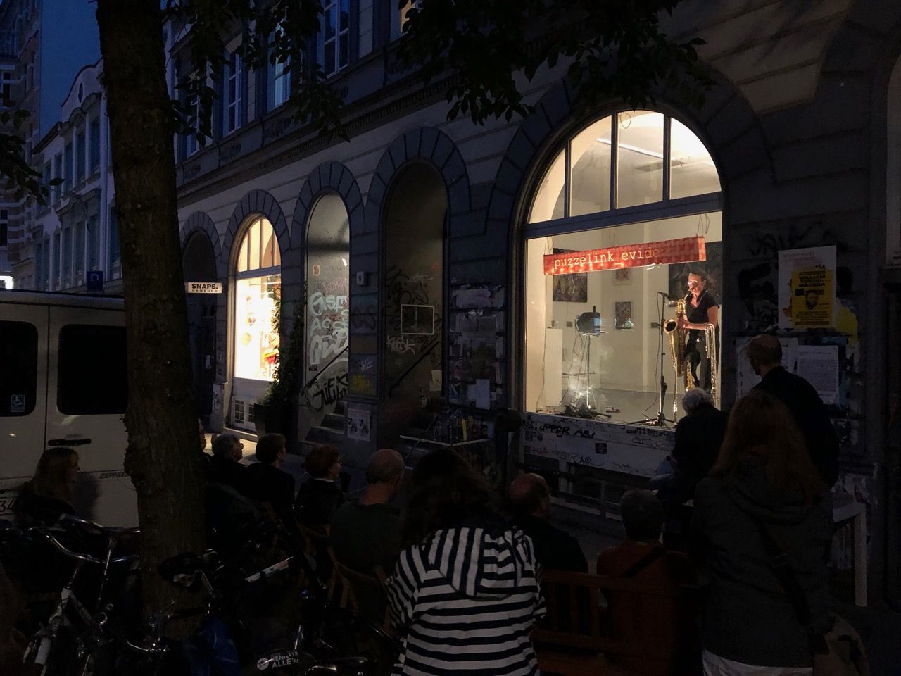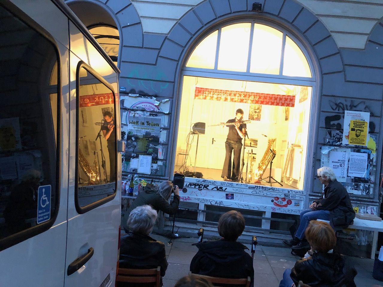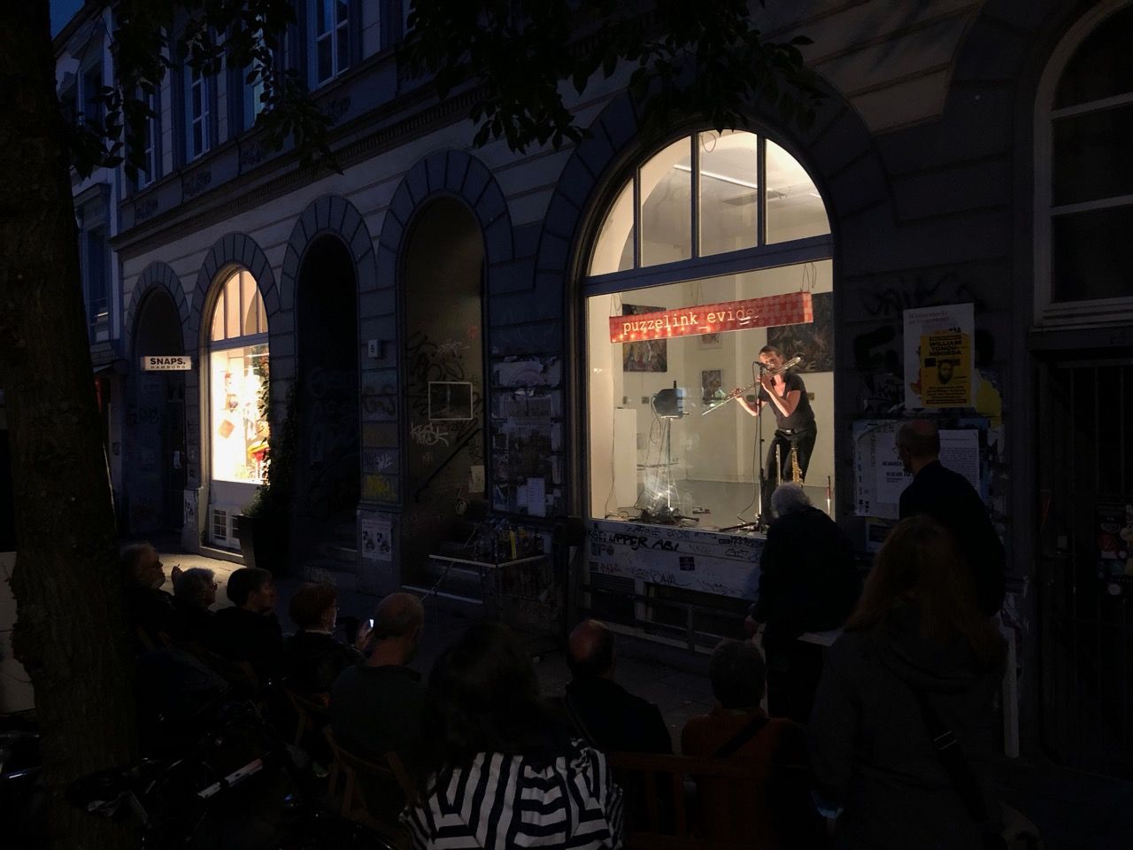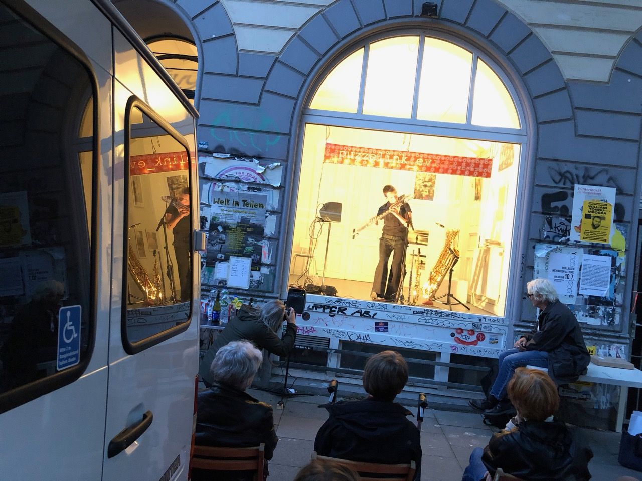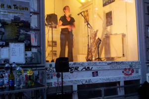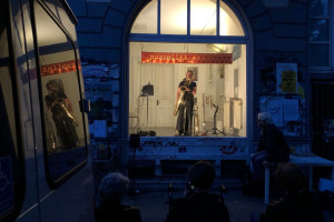 Um 20:30 nehmen sich Töne den Raum. Exklusiv, denn das Publikum, in Distanz gehalten, bleibt draussen auf der Strasse. Es hört aber und sieht Schaufenster-Musik aus der Grotte: Anne Wiemann improvisiert live, hinter trennender Glasscheibe...