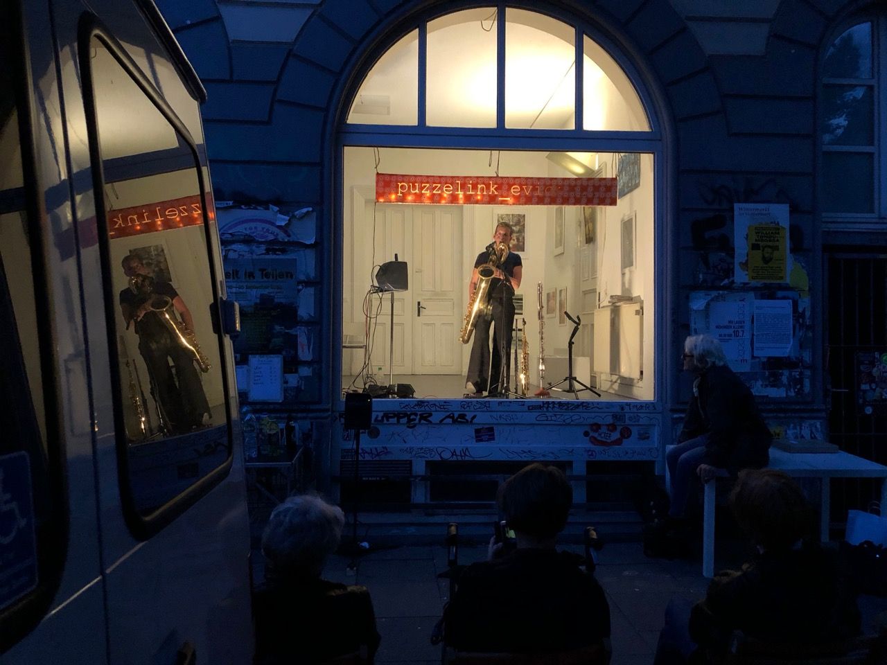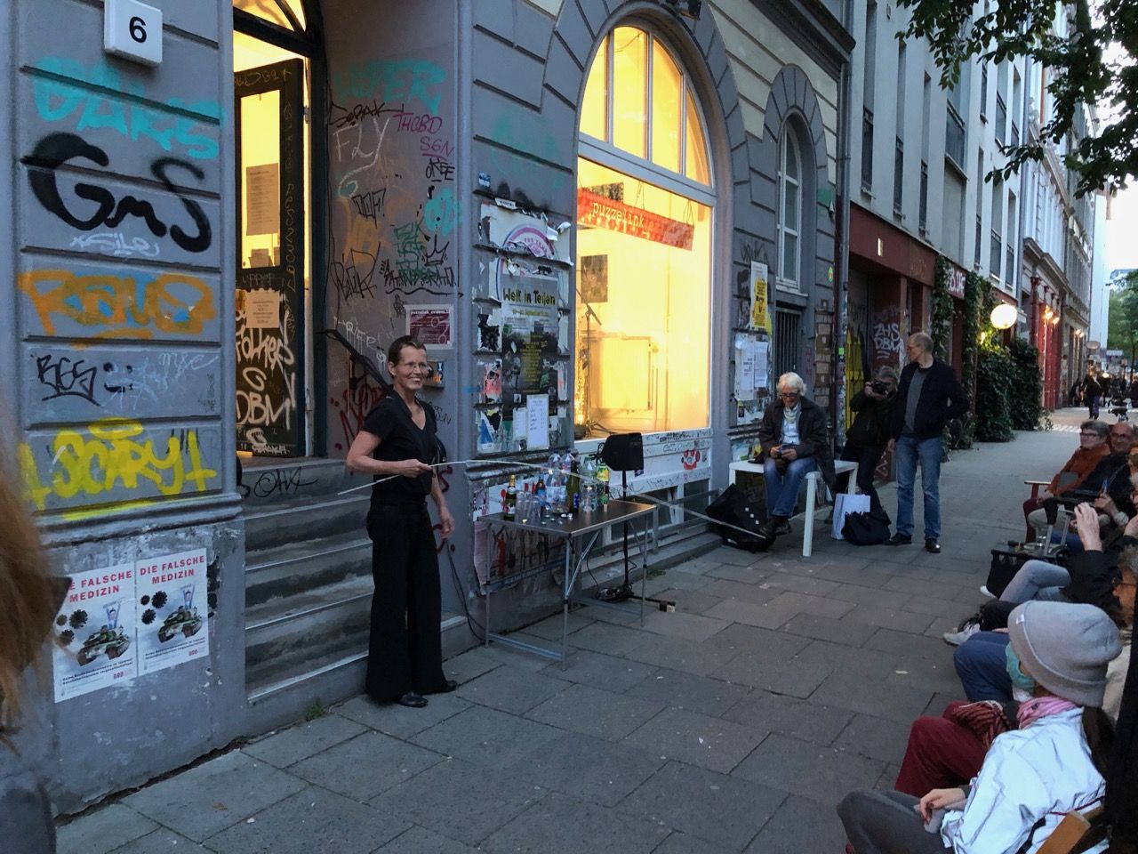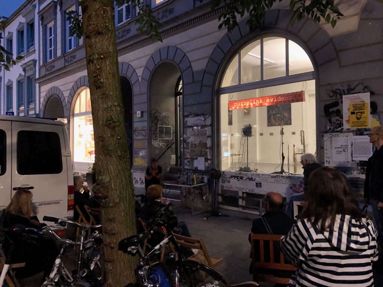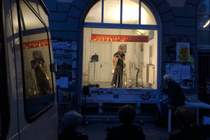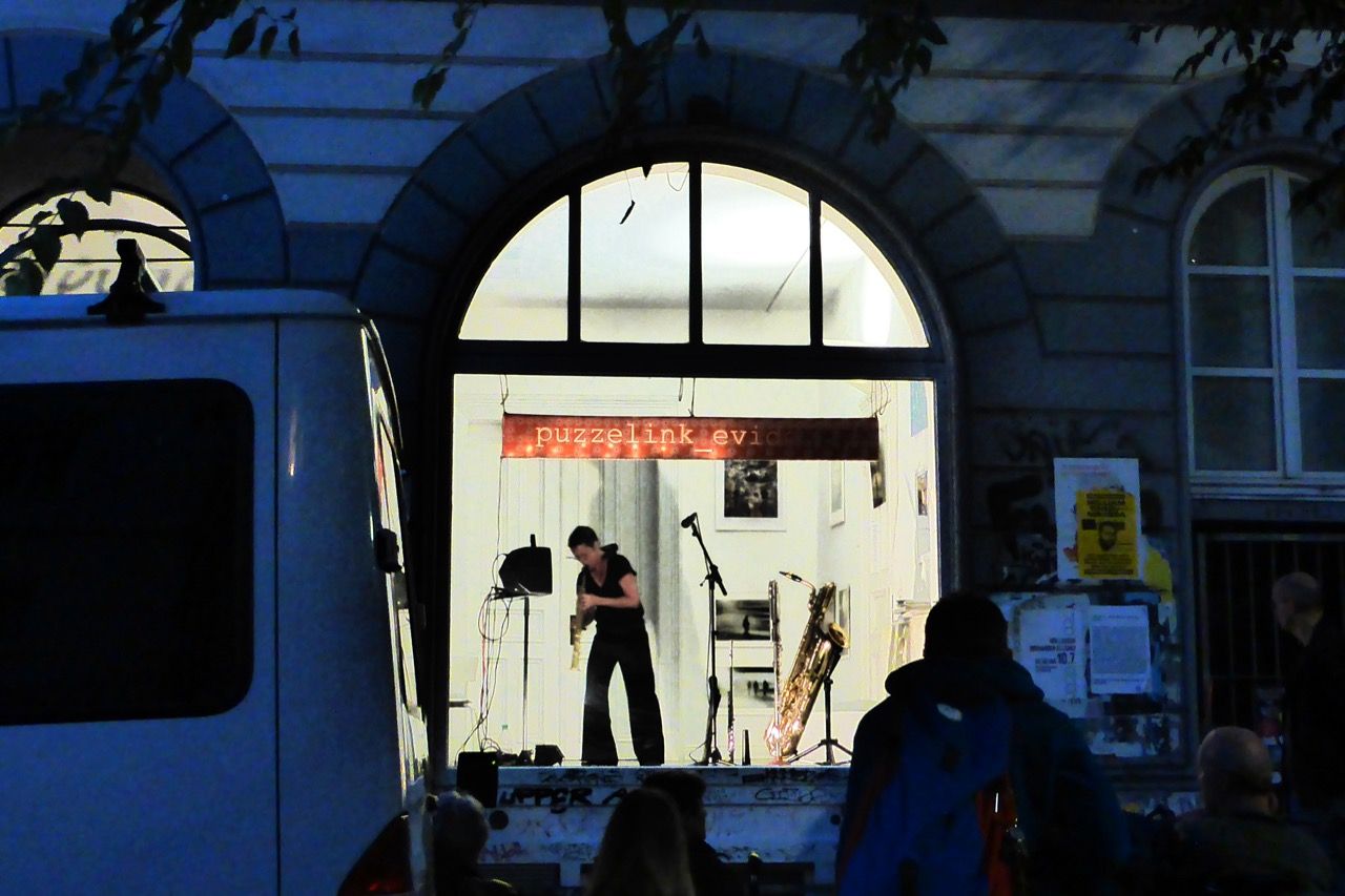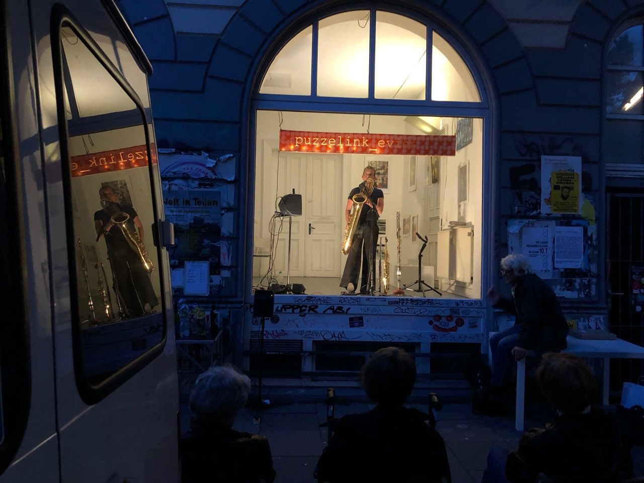 Um 20:30 nehmen sich Töne den Raum. Exklusiv, denn das Publikum, in Distanz gehalten, bleibt draussen auf der Strasse. Es hört aber und sieht Schaufenster-Musik aus der Grotte: Anne Wiemann improvisiert live, hinter trennender Glasscheibe...
