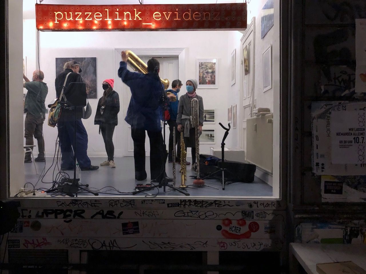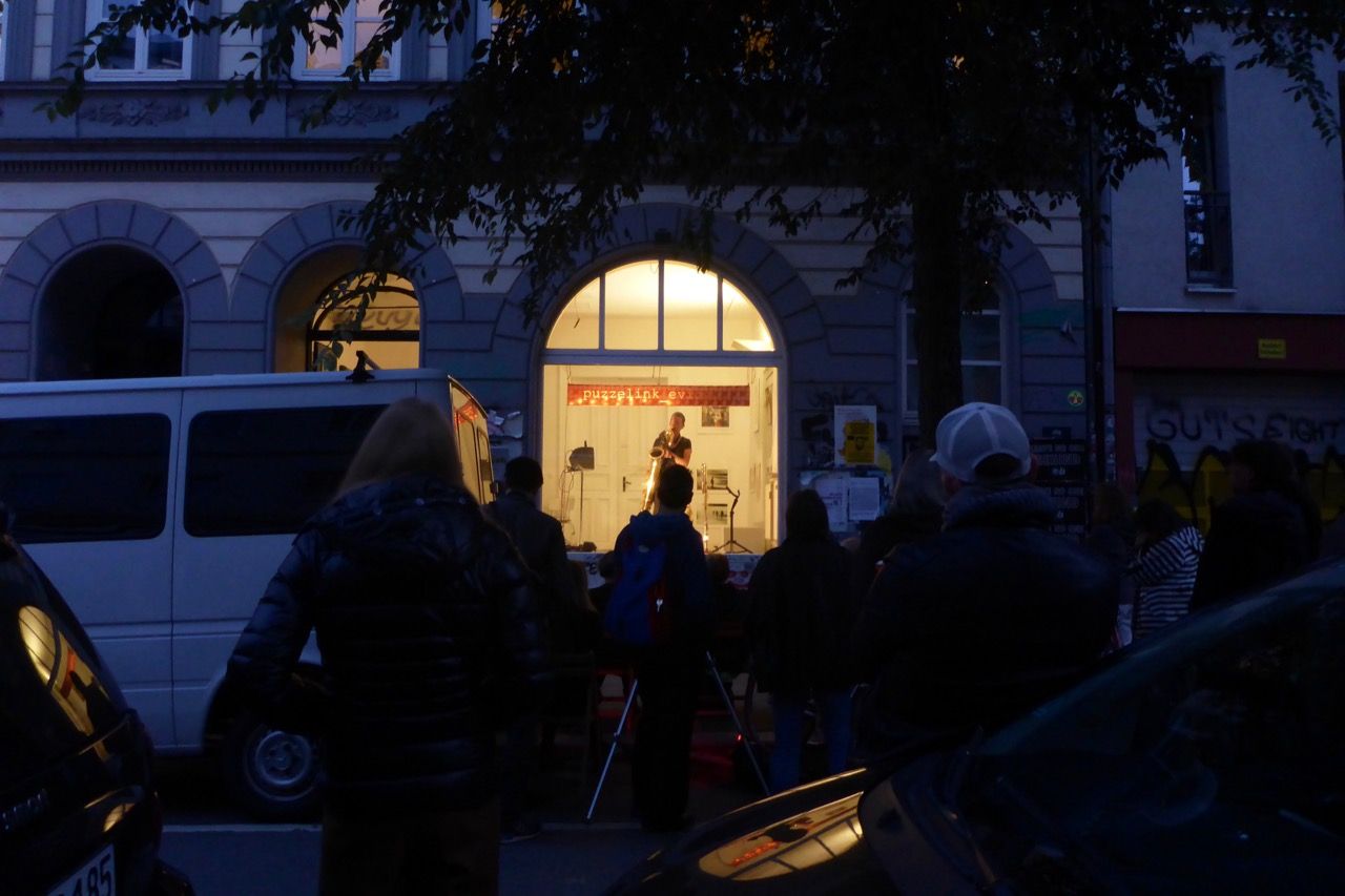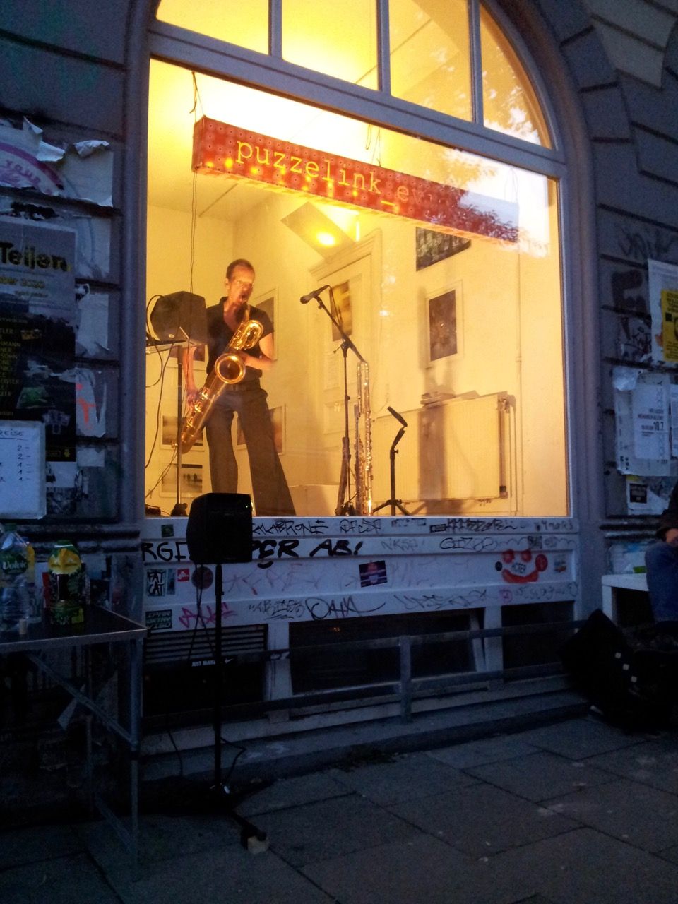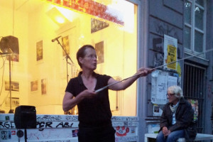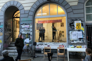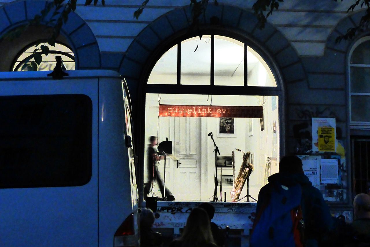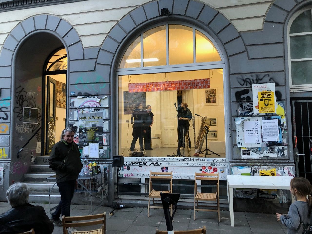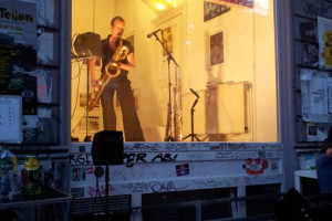 Um 20:30 nehmen sich Töne den Raum. Exklusiv, denn das Publikum, in Distanz gehalten, bleibt draussen auf der Strasse. Es hört aber und sieht Schaufenster-Musik aus der Grotte: Anne Wiemann improvisiert live, hinter trennender Glasscheibe...