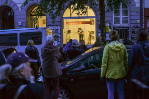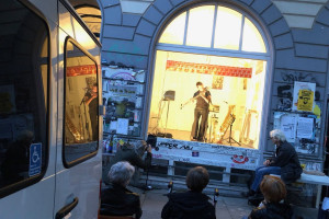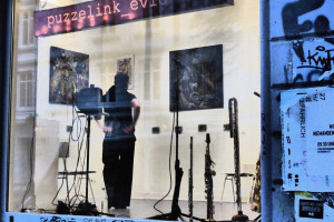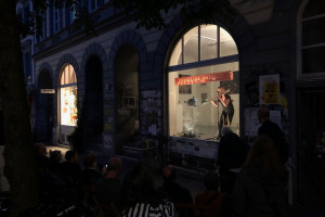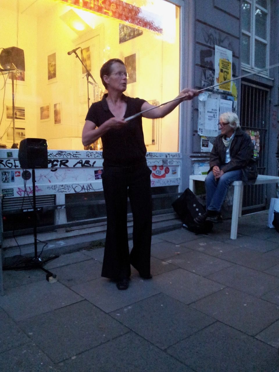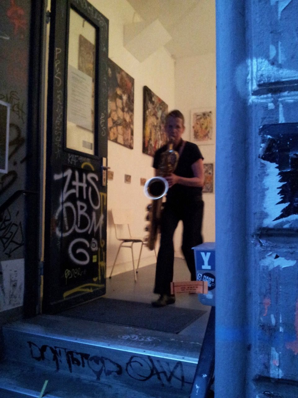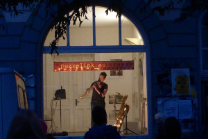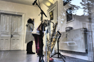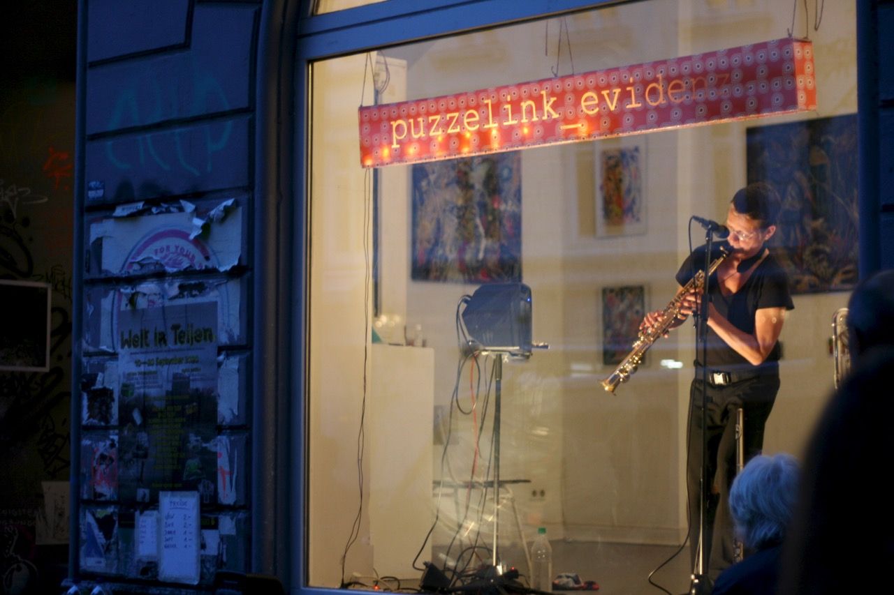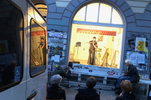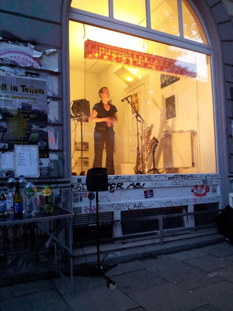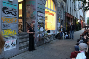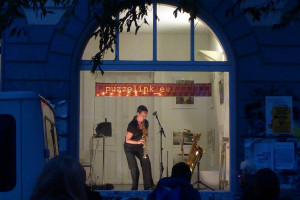 Um 20:30 nehmen sich Töne den Raum. Exklusiv, denn das Publikum, in Distanz gehalten, bleibt draussen auf der Strasse. Es hört aber und sieht Schaufenster-Musik aus der Grotte: Anne Wiemann improvisiert live, hinter trennender Glasscheibe...