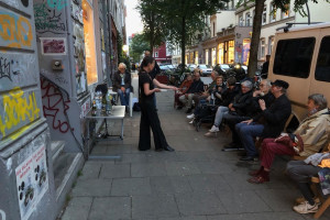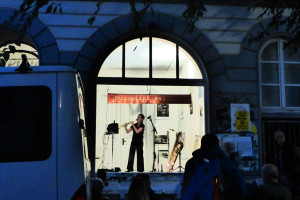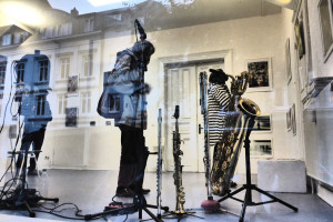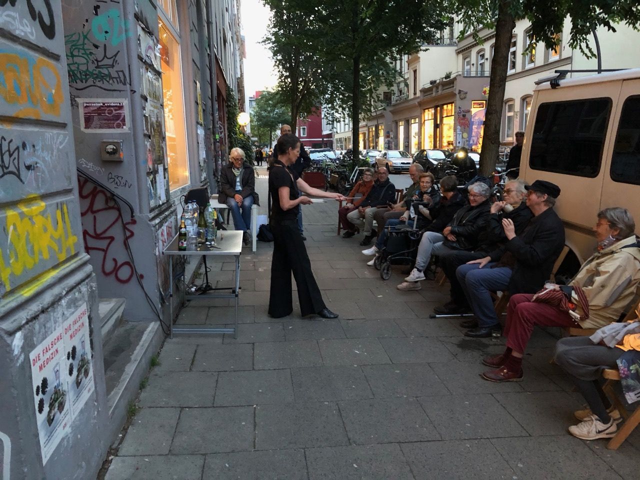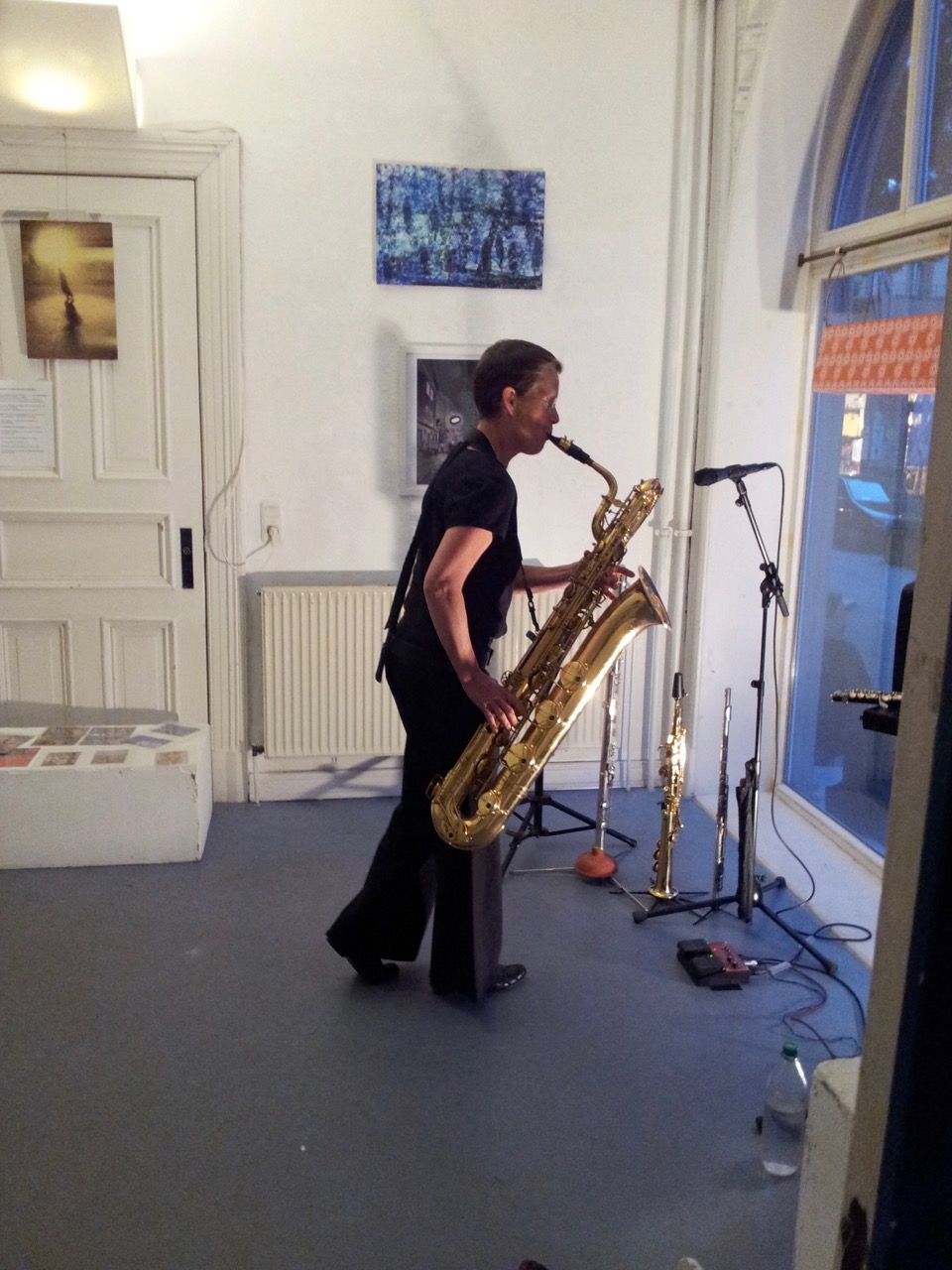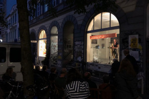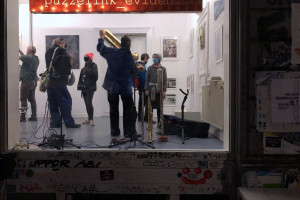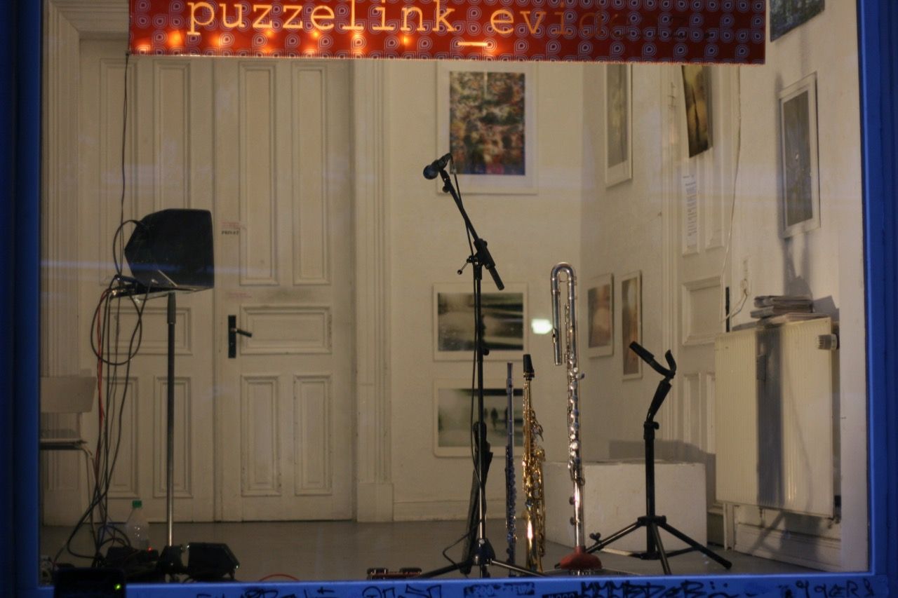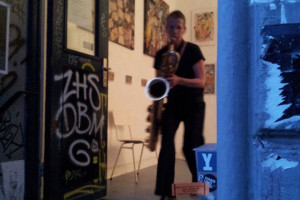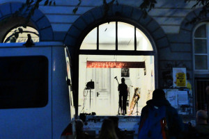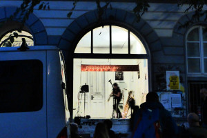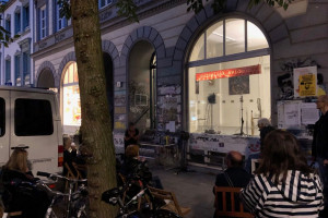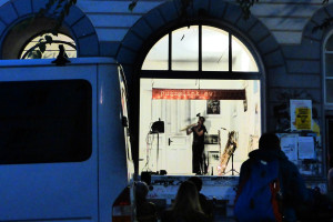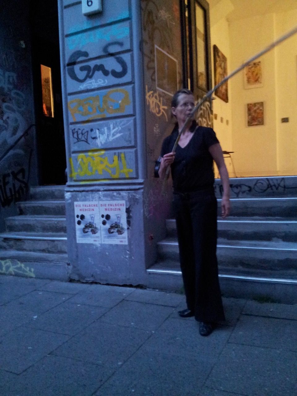 Um 20:30 nehmen sich Töne den Raum. Exklusiv, denn das Publikum, in Distanz gehalten, bleibt draussen auf der Strasse. Es hört aber und sieht Schaufenster-Musik aus der Grotte: Anne Wiemann improvisiert live, hinter trennender Glasscheibe...