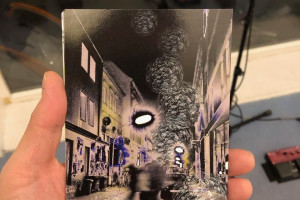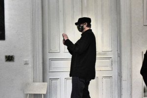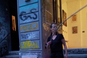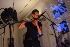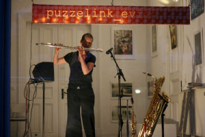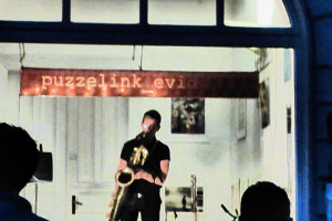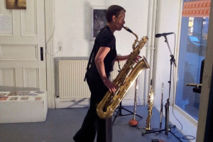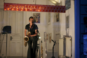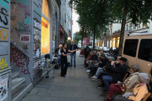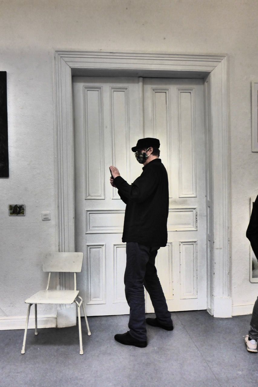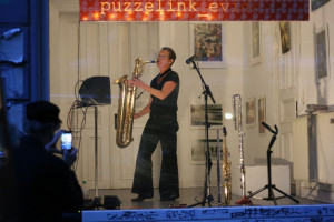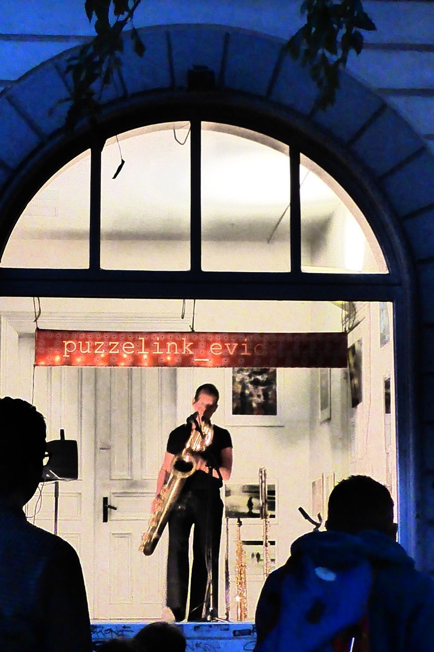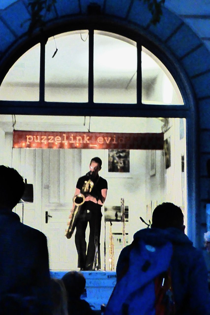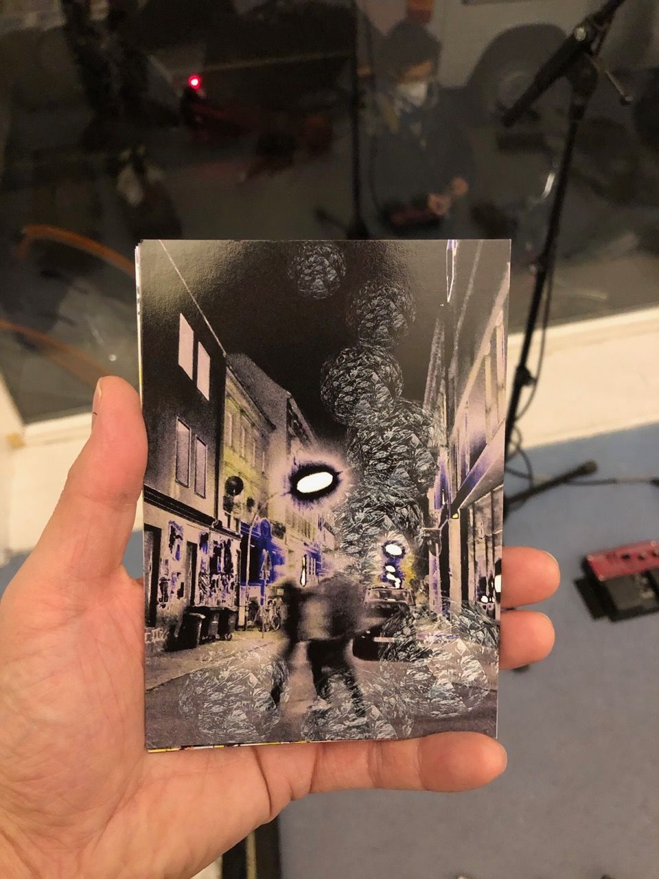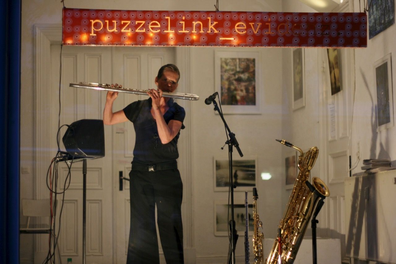Um 20:30 nehmen sich Töne den Raum. Exklusiv, denn das Publikum, in Distanz gehalten, bleibt draussen auf der Strasse. Es hört aber und sieht Schaufenster-Musik aus der Grotte: Anne Wiemann improvisiert live, hinter trennender Glasscheibe...