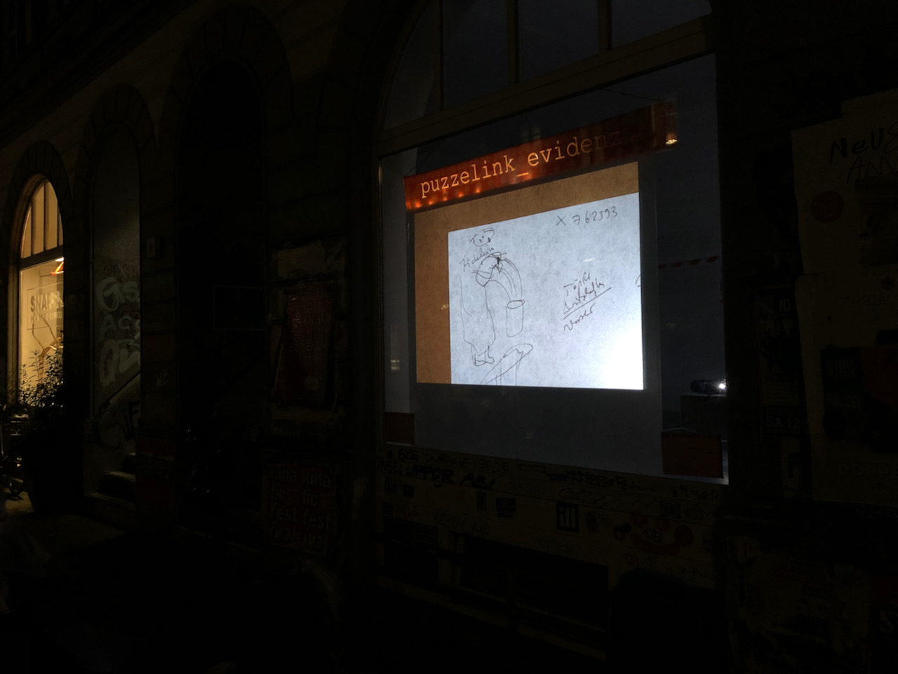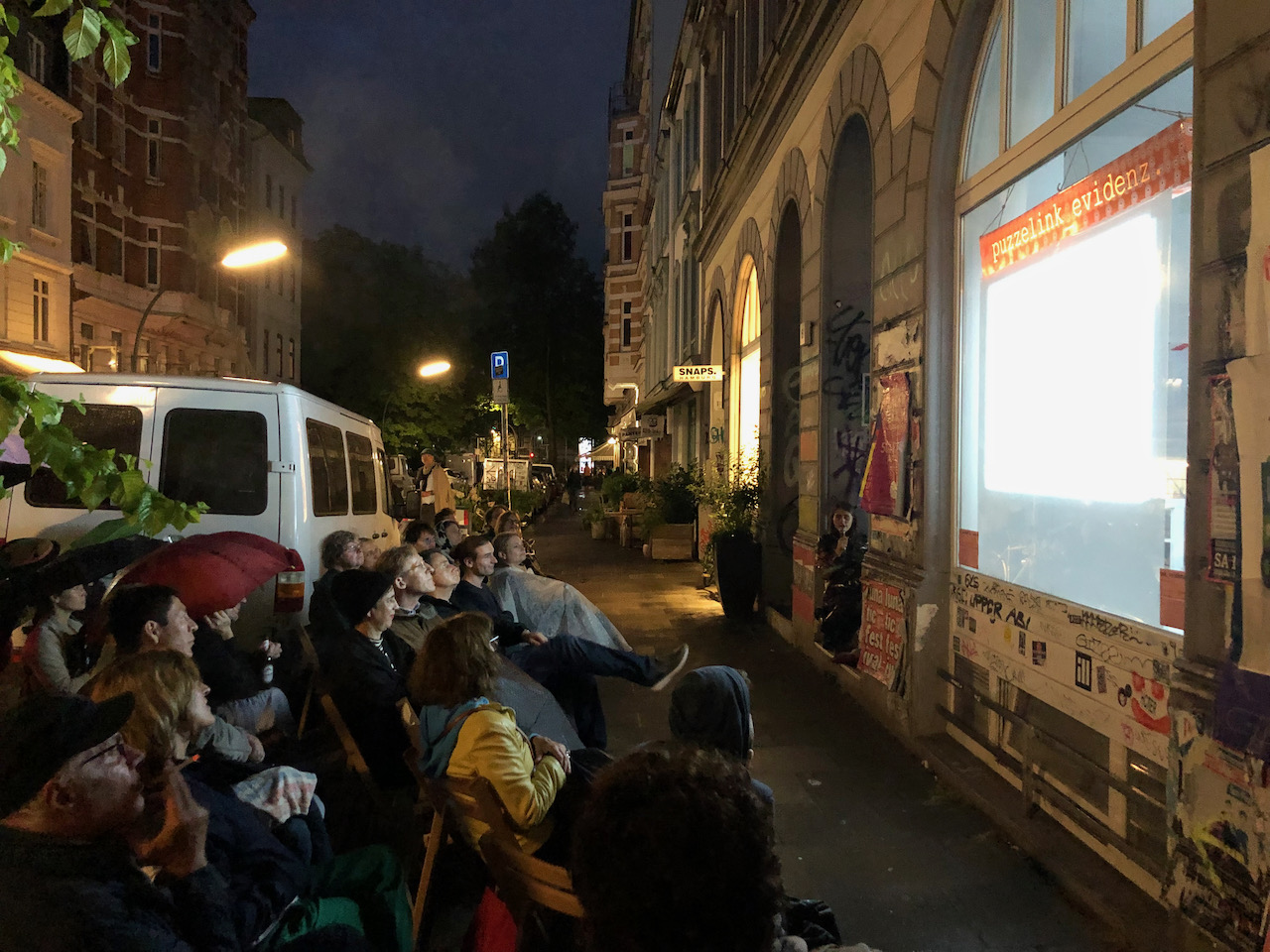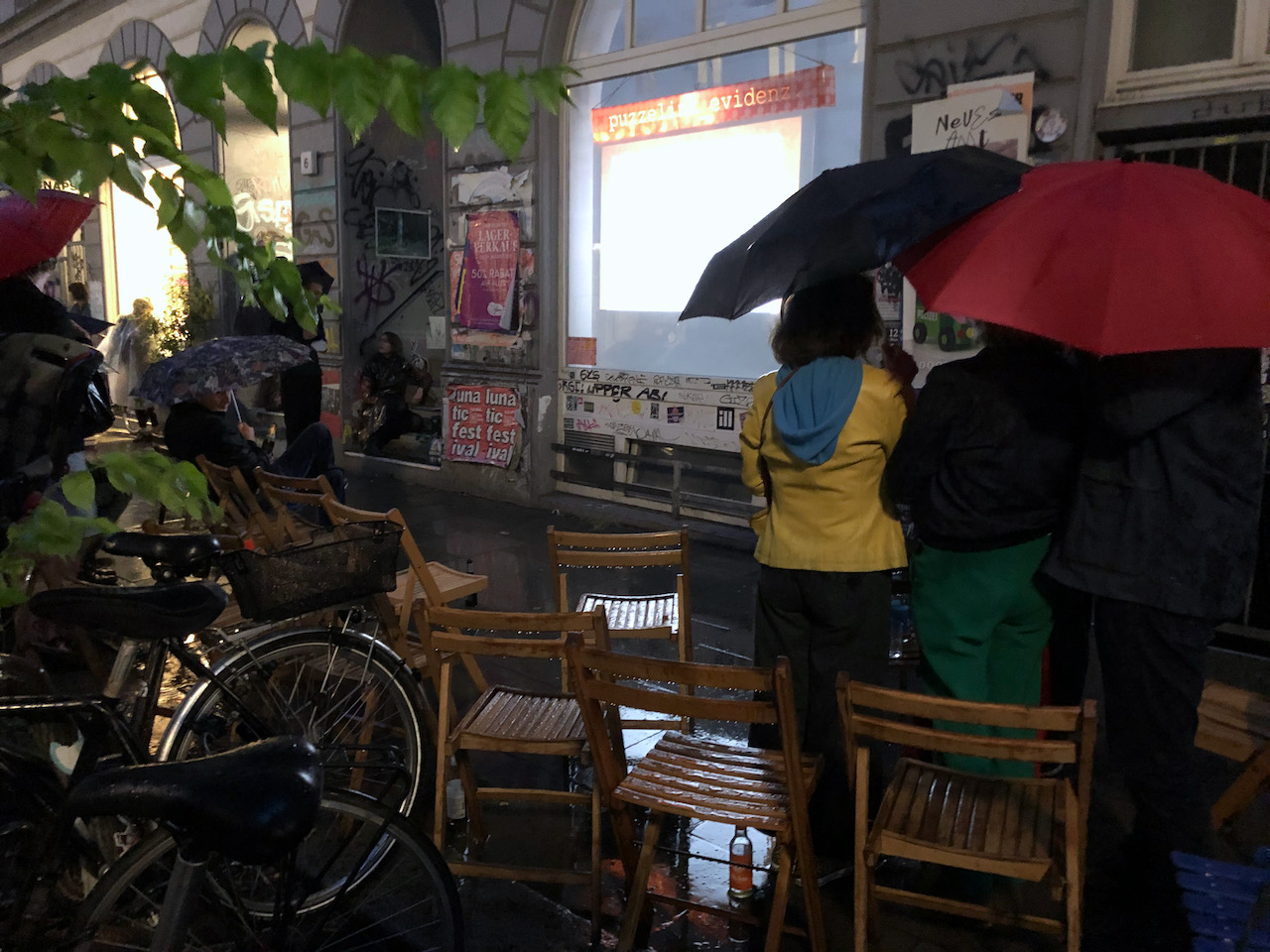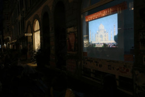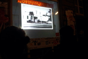 Die Bilder zum Vortrag werden nach außen auf die Straße projiziert. Der Vortrag beginnt bei Anbruch der Dunkelheit.