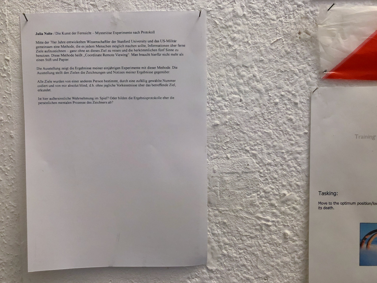 Die Künstlerin und Philosophin Julia Nolte hat diese Methode („Coordinate Remote Viewing“) erlernt und hat etwa ein Jahr lang mit dieser Methode experimentiert. Alle Ziele wurden von einer anderen Person bestimmt und codiert und absolut blind, d.h. ohne jegliche Vorkenntnisse über das betreffende Ziel, erkundet. Die meisten Ziele sind Orte und Monumente von allgemeinem Interesse, manche Ziele sind sehr persönlich und eher mentaler Natur.